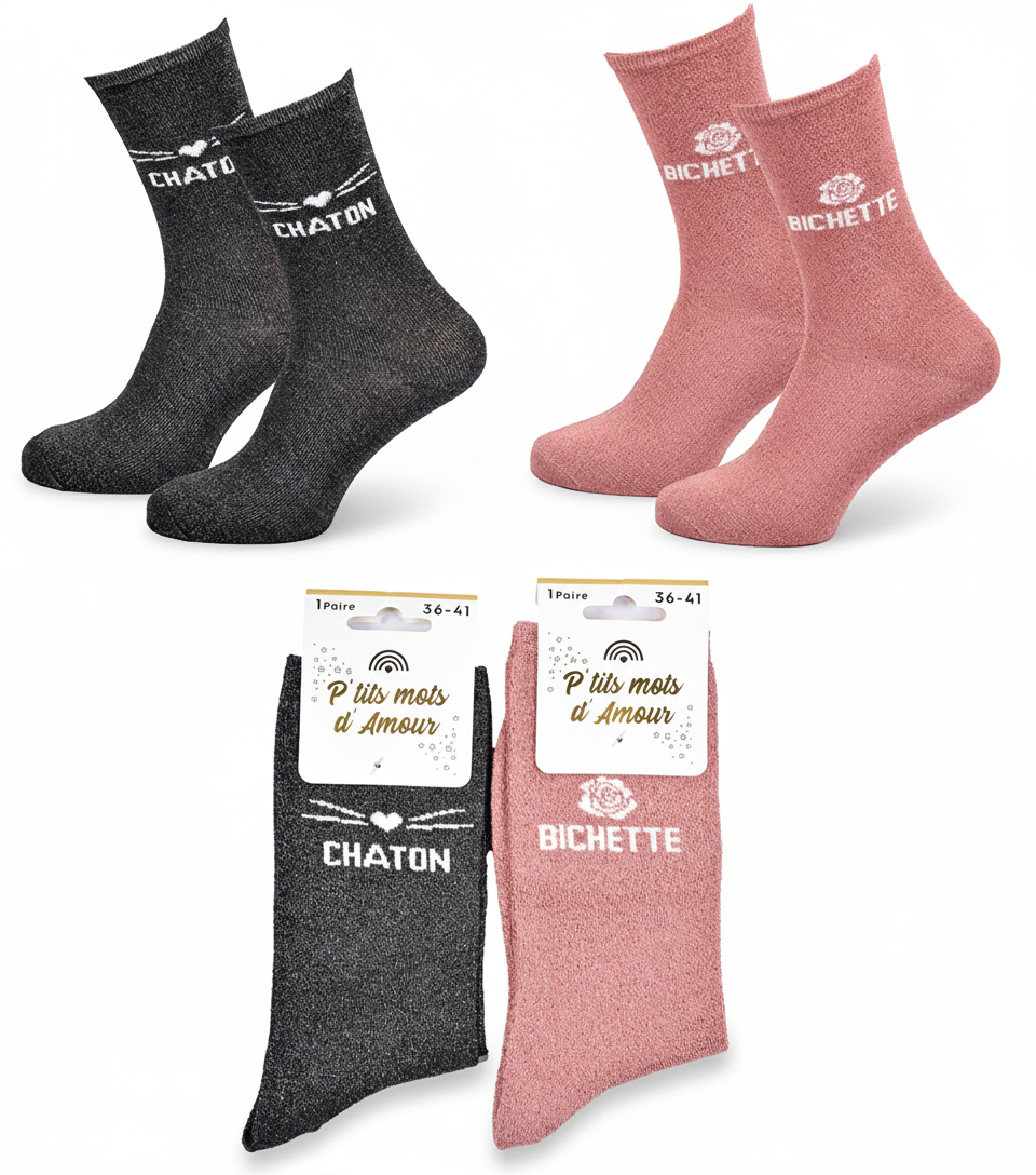 Succombez au charme irrésistible des chaussettes femme lurex, l’accessoire qui combine mode, humour et éclat. Leur fil lurex brillant capte la lumière avec élégance, apportant un effet pailleté subtil, parfait pour les amatrices de looks modernes et féminins. Chaque paire véhicule un petit message drôle et complice, pour affirmer son humeur ou sa personnalité avec légèreté. Idéales à offrir, ces chaussettes sont livrées dans un blister raffiné “P’tits mots d’Amour” et se transforment en une excellente idée cadeau pour toutes les occasions : Saint-Valentin, Noël, fête des mères, ou simplement pour faire sourire. Disponibles en taille unique femme 36/41, elles assurent un confort optimal, une bonne élasticité et un touché doux agréable à porter. Un indispensable du dressing féminin, aussi pétillant que confortable !