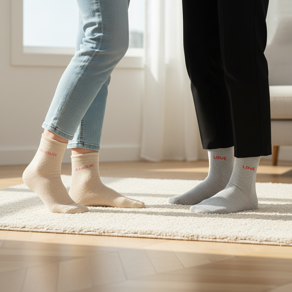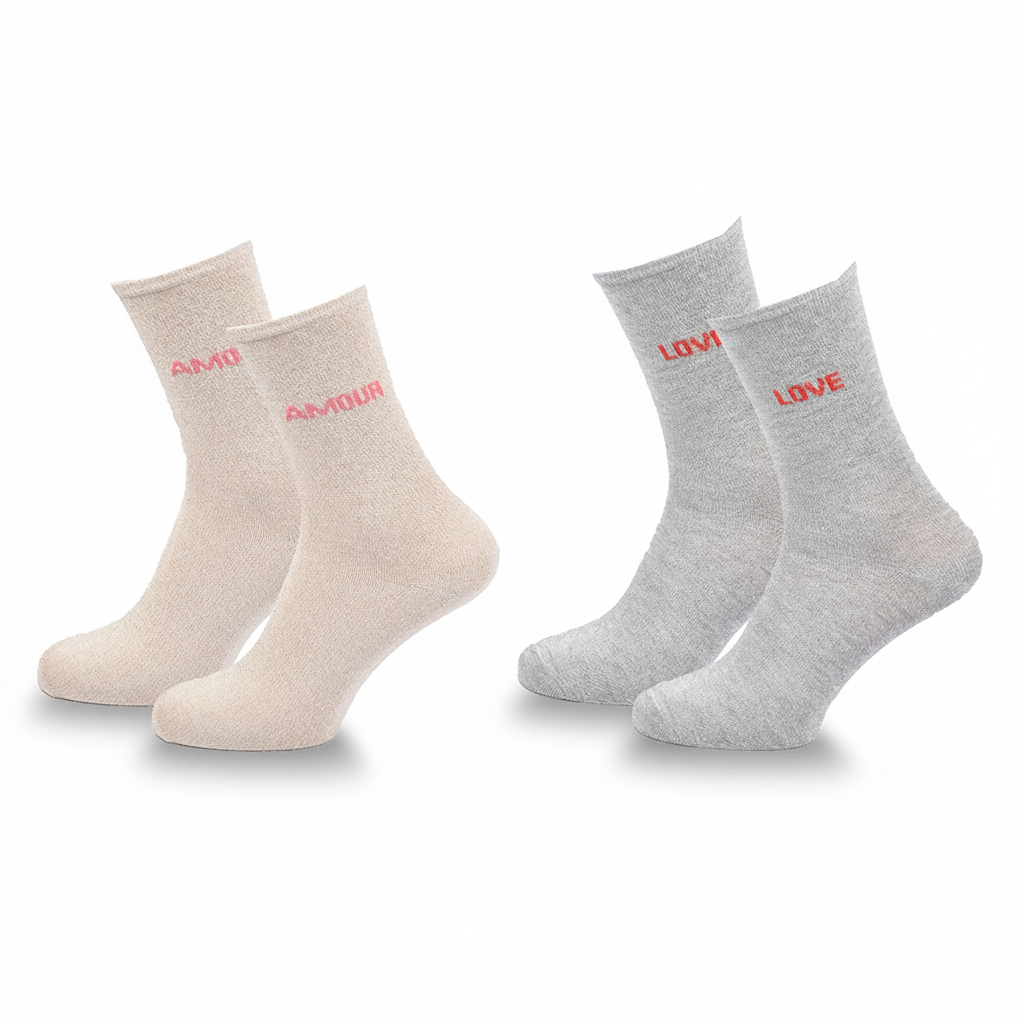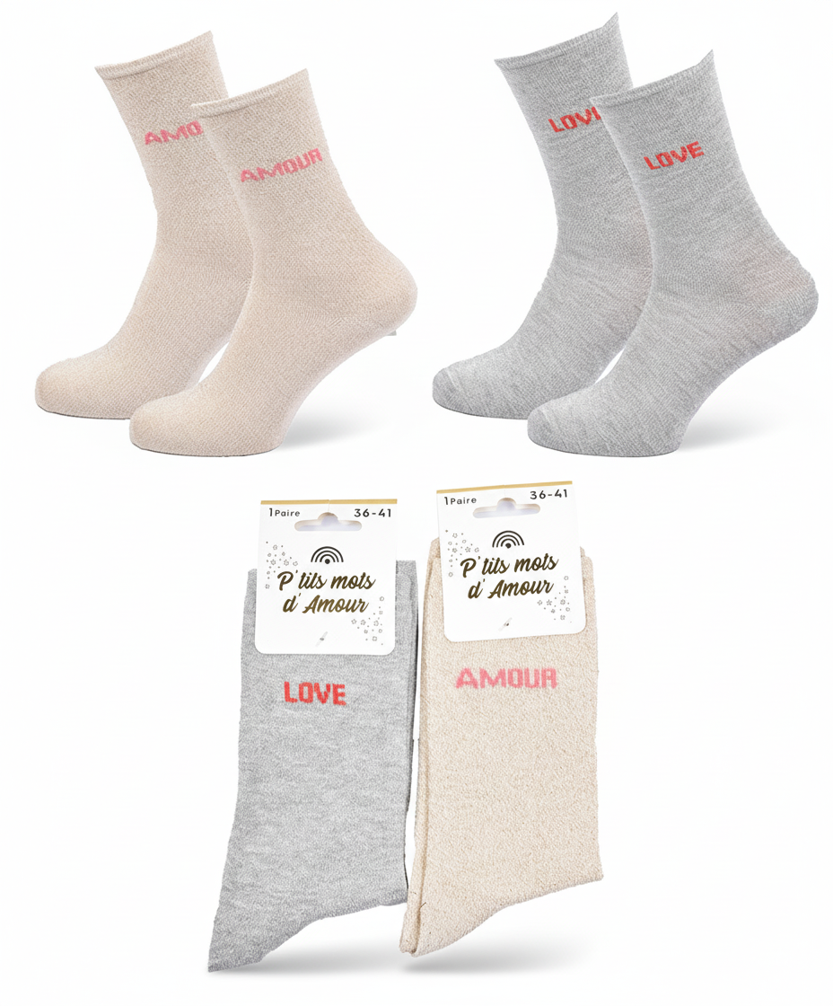 Succombez au charme irrésistible des chaussettes femme lurex, l’accessoire qui combine mode, humour et éclat. Leur fil lurex brillant capte la lumière avec élégance, apportant un effet pailleté subtil, parfait pour les amatrices de looks modernes et féminins. Chaque paire véhicule un petit message drôle et complice, pour affirmer son humeur ou sa personnalité avec légèreté. Idéales à offrir, ces chaussettes sont livrées dans un blister raffiné “P’tits mots d’Amour” et se transforment en une excellente idée cadeau pour toutes les occasions : Saint-Valentin, Noël, fête des mères, ou simplement pour faire sourire. Disponibles en taille unique femme 36/41, elles assurent un confort optimal, une bonne élasticité et un touché doux agréable à porter. Un indispensable du dressing féminin, aussi pétillant que confortable !