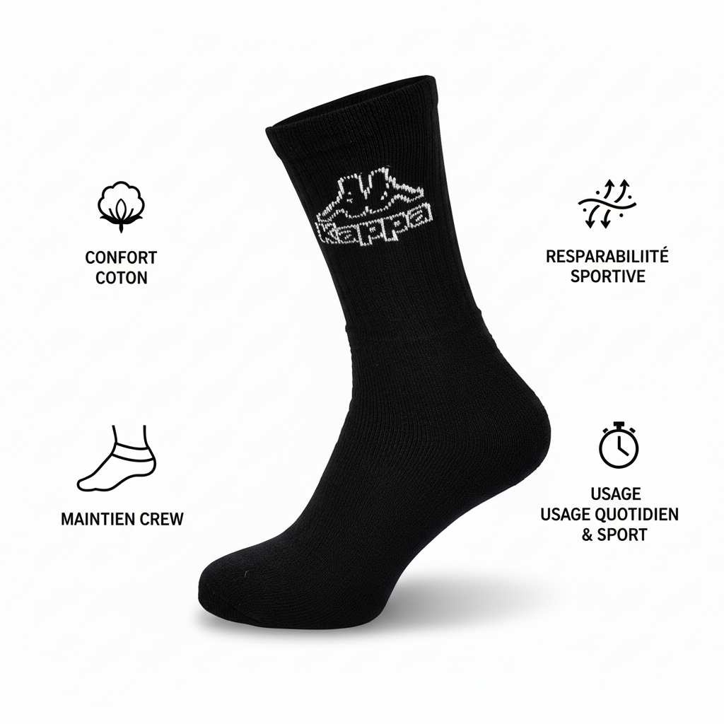 Le pack de 6 paires de chaussettes Kappa homme offre un compromis idéal entre confort, durabilité et style sportif. Leur tige mi-mollet (crew) assure un maintien efficace du pied et une stabilité naturelle dans la chaussure. La composition majoritairement en coton respirant garantit douceur, confort thermique et évacuation naturelle de l’humidité. Adaptées aux activités sportives comme à l’usage quotidien, ces chaussettes Kappa s’inscrivent dans l’esthétique sportswear et urbaine de la marque. Les logos Kappa Omini sont parfaitement intégrés pour un style authentique et moderne. Ce pack de 6 paires est disponible en noir, blanc, ou en assortiment noir & blanc, en tailles 39/42 ou 43/46. Un choix pratique qui assure un renouvellement facile de votre garde-robe sportive au quotidien.