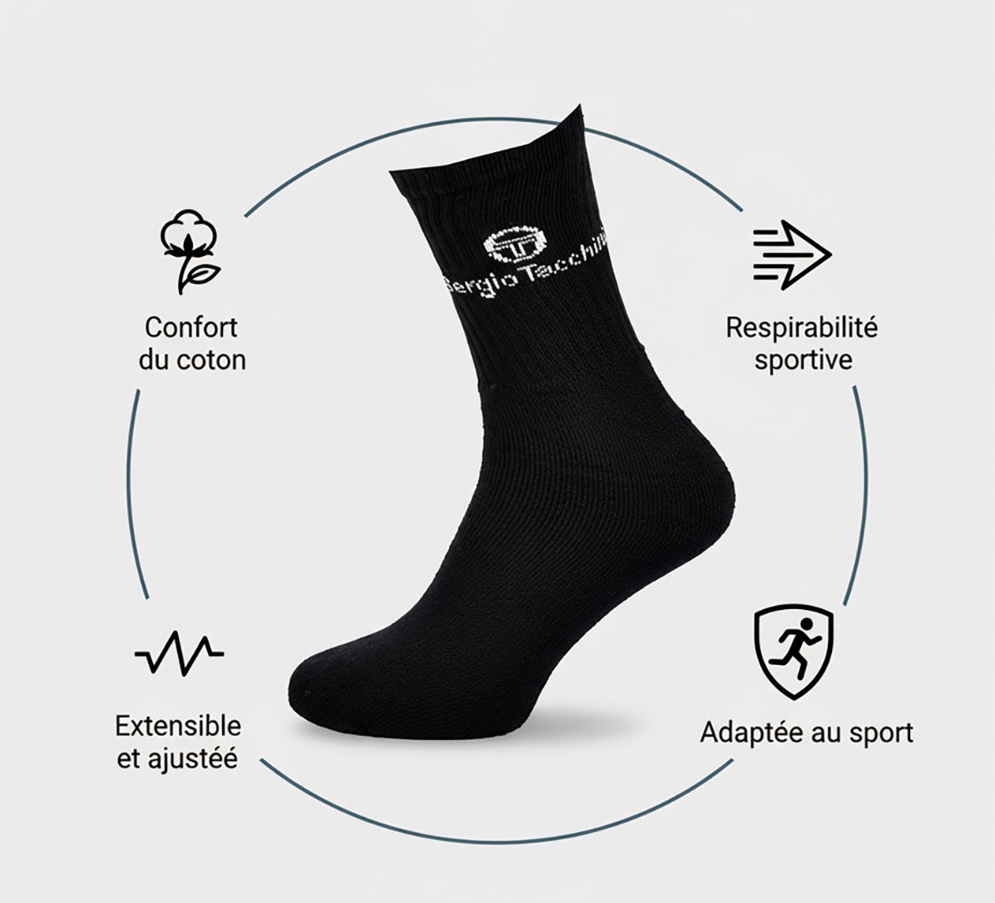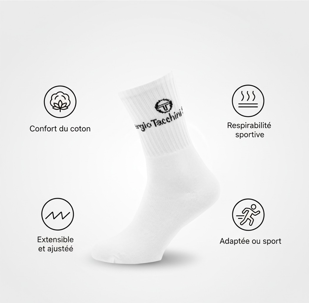 Chaussettes Homme Tennis Sportswear – Sergio Tacchini (Pack) Offrez confort, performance et style avec ce pack de chaussettes Sergio Tacchini Tennis Sportswear pour homme. Idéales pour la pratique du sport comme pour un usage quotidien, elles maintiennent parfaitement le pied et garantissent une respirabilité optimale. Leur coupe mi-mollet (crew) assure un ajustement confortable et un bon maintien durant l’effort.  Pourquoi choisir Sergio Tacchini ? Fondée en 1966 par le champion de tennis italien Sergio Tacchini, la marque incarne l’authenticité, le style et l’innovation. Pionnière dans l’univers du sportswear haut de gamme, elle a marqué l’histoire du tennis en introduisant couleurs et motifs dans un sport jusque-là très classique. Aujourd’hui encore, Sergio Tacchini continue d’unir sport, mode et culture à travers des collections emblématiques.  Caractéristiques produit : Pack de chaussettes homme Tennis Sportswear Coupe : mi-mollet (Crew) pour confort et maintien Couleurs disponibles : Blanc, Noir ou Assorti Tailles : 39/42 – 43/46 Composition : coton majoritaire, respirant et doux Entretien : lavable en machine à 30°C  Idéales pour : La pratique du tennis et des sports intensifs Un look sportswear au quotidien Offrir un cadeau original et utile signé Sergio Tacchini