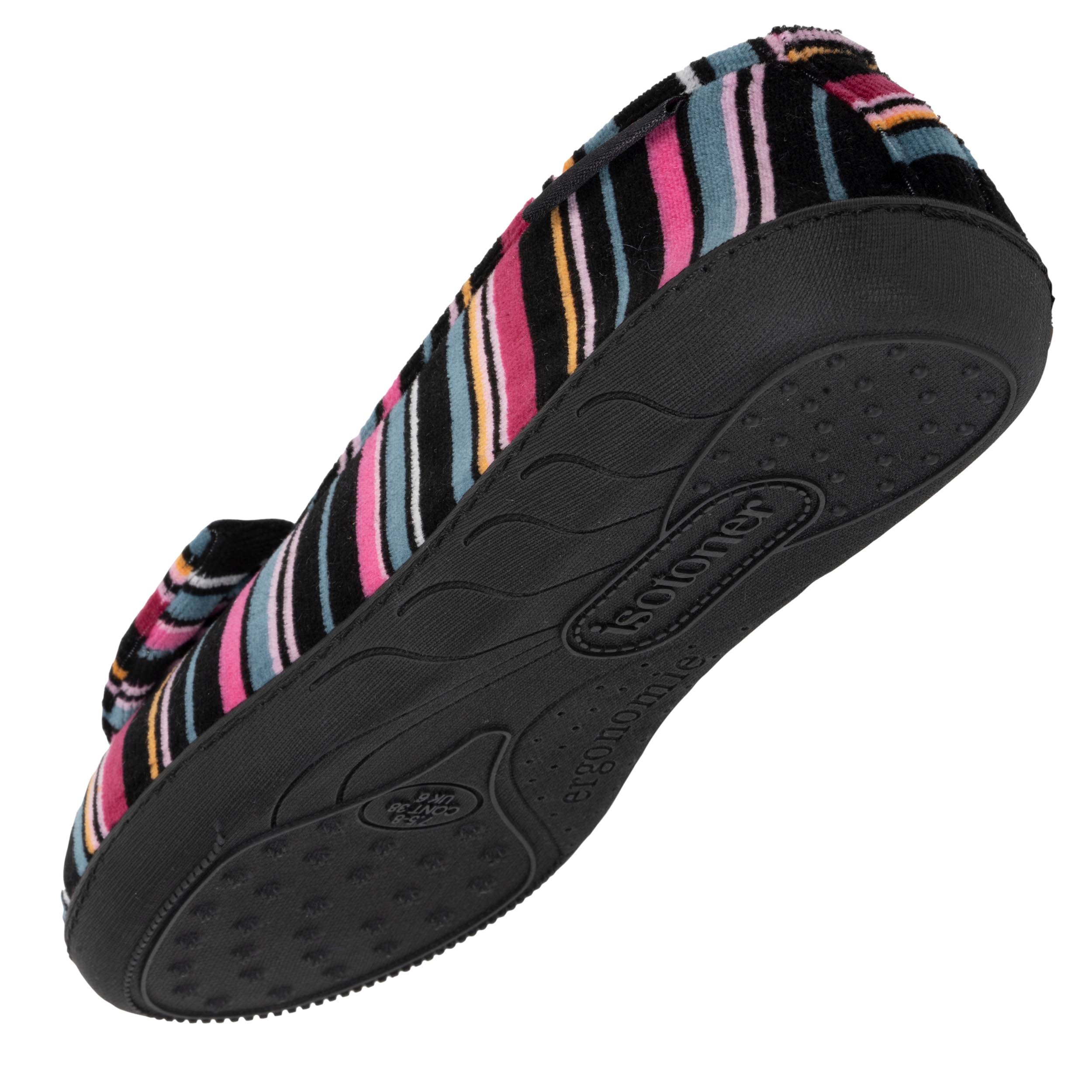 Ces chaussons ballerines pour femme rayures roses en velours majoritairement composé de coton sont colorés, respirants et confortables : ces chaussons ballerines roses sont dotées d'une semelle ergonomique et de mousse à mémoire de forme pour soutenir votre voûte plantaire et s'adapter à la forme de votre pied pour un confort optimal. Ces pantoufles pour femme sont lavables en machine à 30°C.