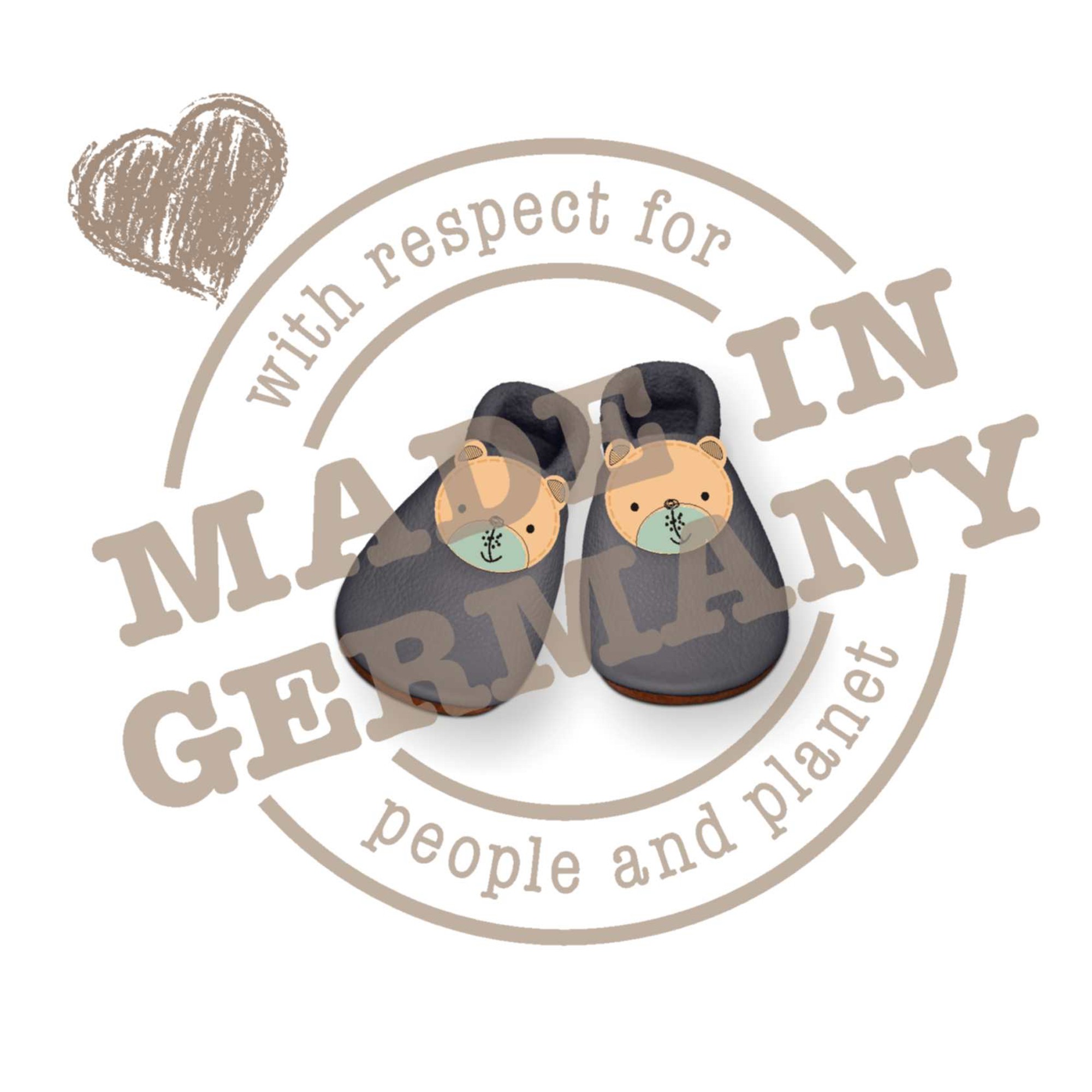 Avec une grande attention portée aux détails et des matériaux durables et de haute qualité, nous sommes à la recherche constante de ce qu'il y a de mieux pour les enfants.Ces babyshoes en cuir souple ont été confectionnées en matériaux de haute qualité à Francfort, en Allemagne. Qu'il s'agisse de protéger les pieds des courants d'air ou d'aider Bébé à ramper et se hisser jusqu'à ses premiers pas, les chaussons en cuir souple restent le choix de référence, l'alliance parfaite du confort et du bien-être. Premiers pas, naturellement. Se tenir sur ses petites jambes. Oser faire les premiers pas. Découvrir le monde sous un nouvel angle. Dans ces chaussures pour enfant, Bébé deviendra vite un grand ! Confection à la main à partir de matériaux écologiques de haute qualité, par des spécialistes qui ont des petits pieds dans le cœur.Apprendre à marcher est un processus naturel. Et les petits pieds sont plus à l'aide dans des chaussures faites de matériaux naturels.Les chaussons en cuir véritable possèdent des propriétés intéressantes incomparables :- matériau écologique respirant