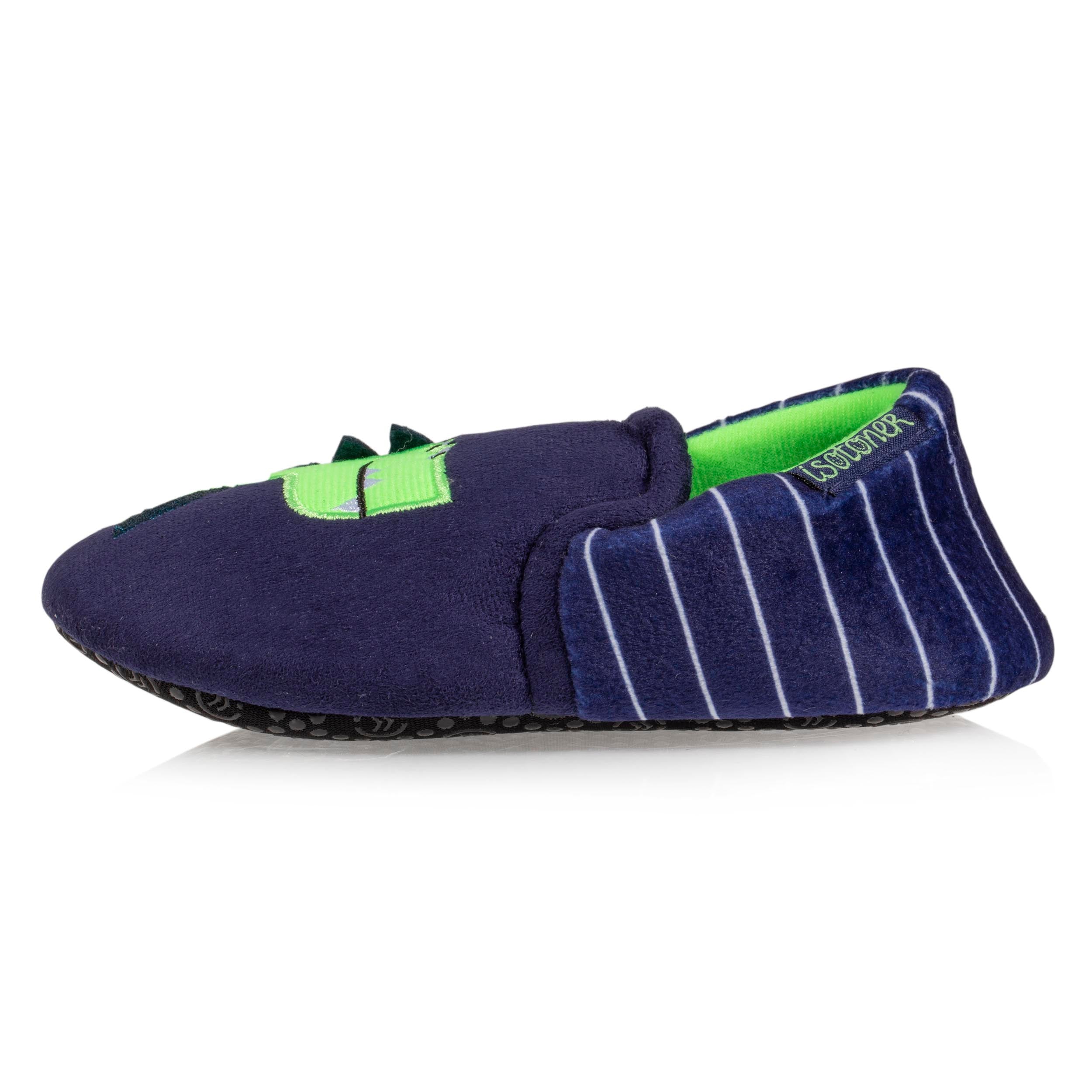Ces chaussons brodés d'un dinosaure seront les préférés de votre enfant ! Faciles à enfiler, la suédine de ce chausson slipper tiendra chaud aux pieds de votre enfant. Grâce à leur semelle en textile à picots en gomme antidérapante, ce chausson lui garantira sécurité. Ces chaussons sont lavables en machine à 30°C.