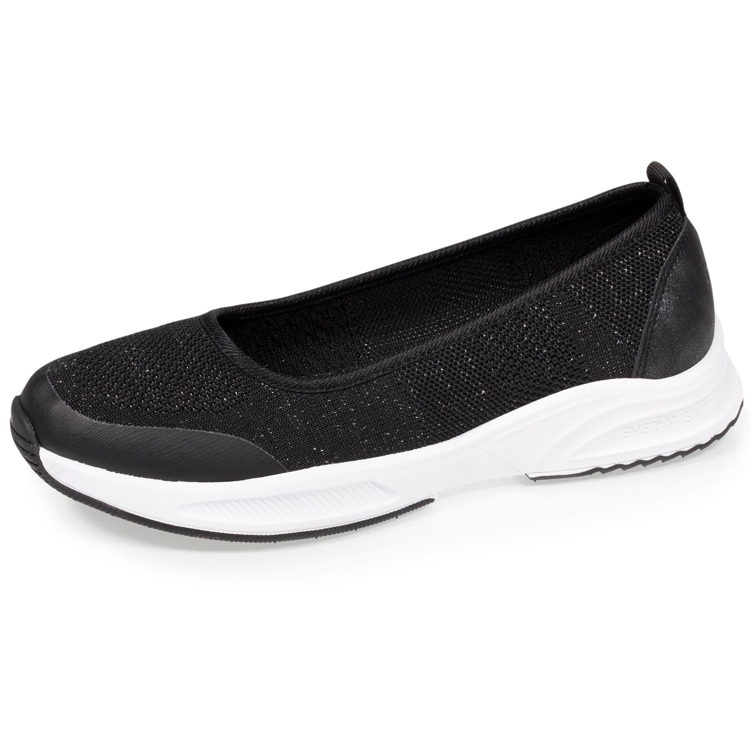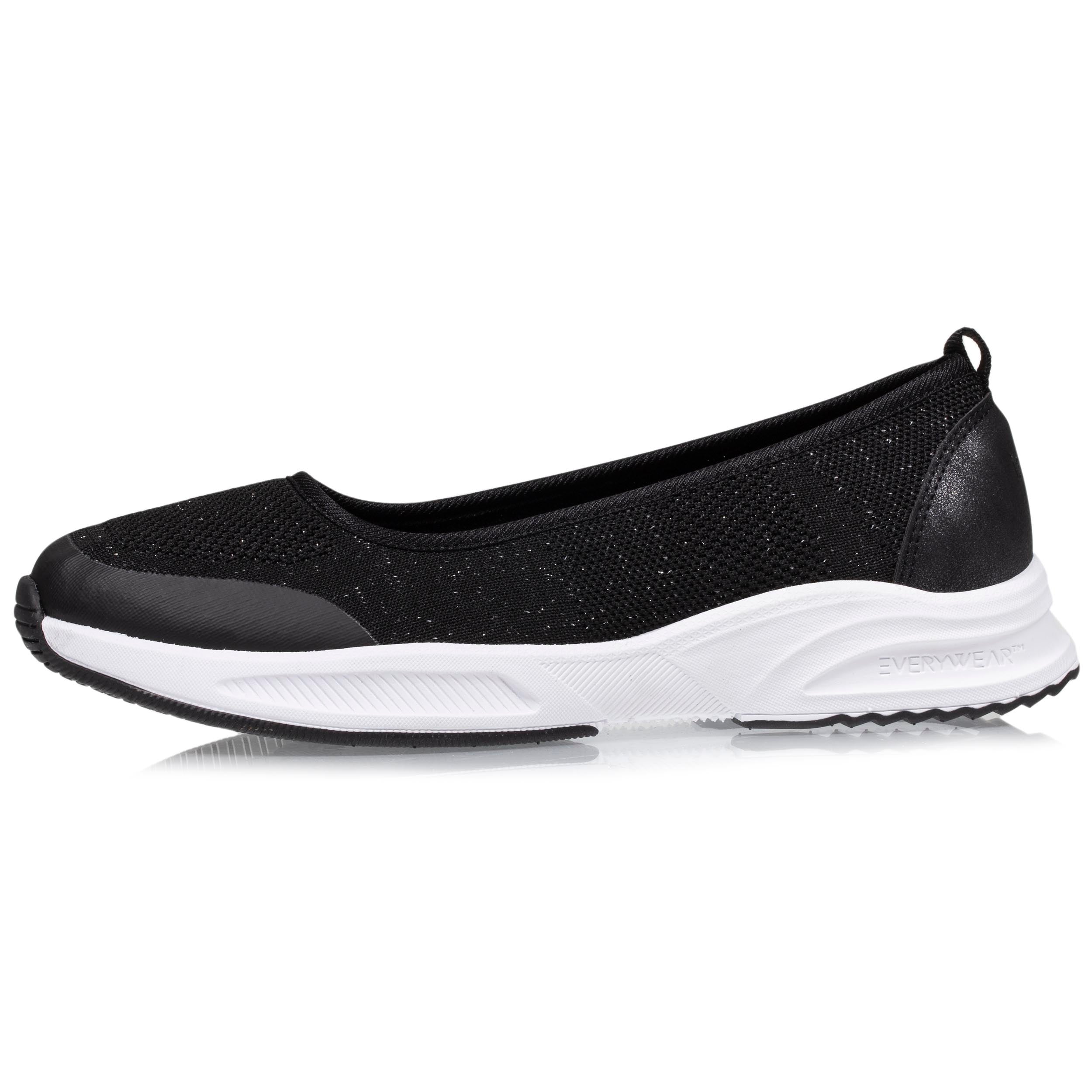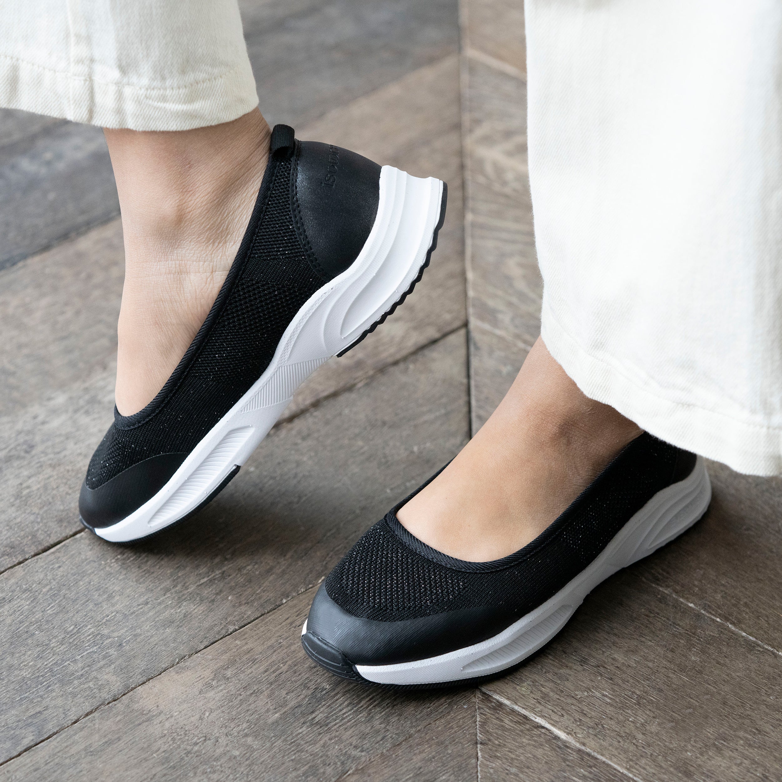 Cette chaussure ballerine femme noire slip-on permet d'allier légèreté, confort et modernité. Avec sa semelle sport souple et légère, dotée de notre technologie EVERYWEAR™ composée à 70% de caoutchouc, cette ballerine est l'indispensable de votre collection de chaussures. La semelle intérieure à mémoire de forme s'adapte à la morphologie de votre pied et garantit le confort nécessaire. La maille extensible de cette chaussure ballerine pour femme, munie d'une touche de brillance avec le lurex, assure confort et facilité à enfiler. Cette ballerine devient votre allié du quotidien. Choisissez votre pointure habituelle