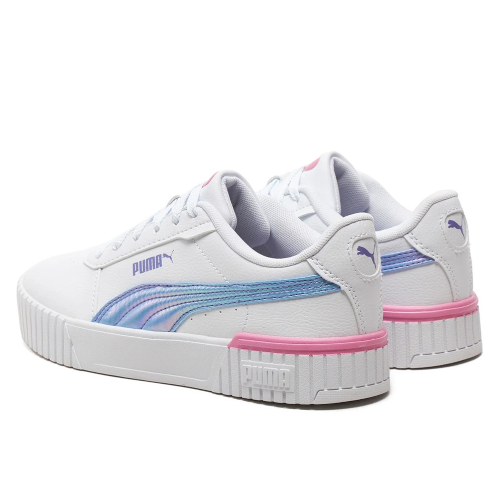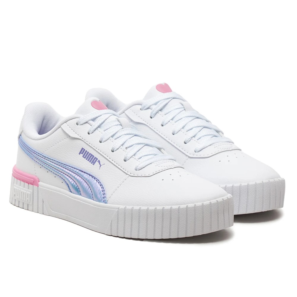 Chaussures de sport Puma 39797001 Carina 2.0 Bouncy Sky pour fille blanches. Les Puma Carina 2.0 JR sont des baskets modernes inspirées du style des années 80, créées pour les jeunes amateurs de mode urbaine. Leur silhouette tennis, enrichie d'accents holographiques et de nouveaux détails tels que des lignes plus larges sur la semelle ou le logo PUMA sur le talon, confère aux chaussures un caractère frais et dynamique. Un intérieur doux et rembourré offre un confort tout au long de la journée, tandis que des matériaux durables, y compris recyclés, garantissent la longévité. C'est la combinaison parfaite de style, de confort et de fonctionnalité pour un usage quotidien.