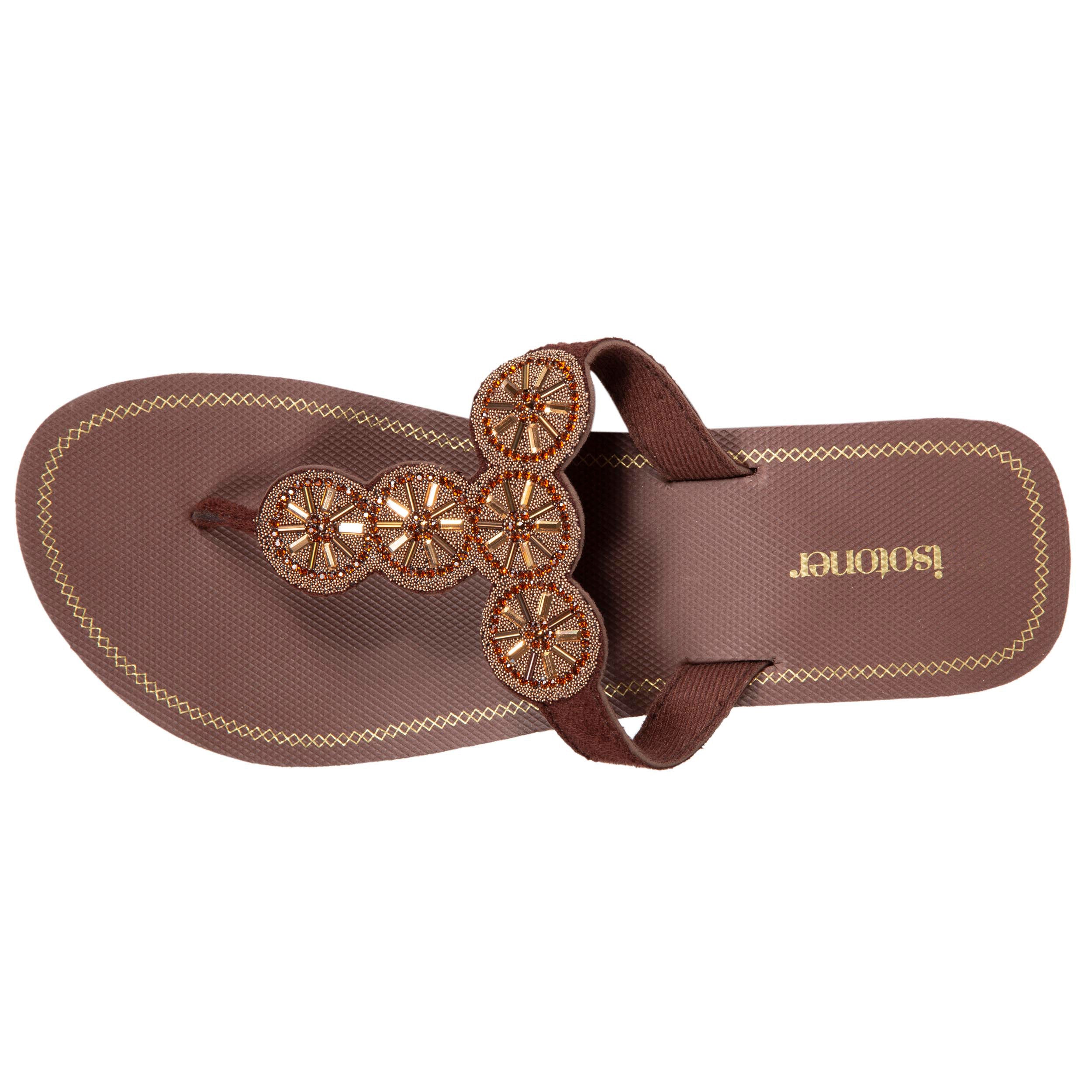 Craquez pour ces tongs à talon compensé marrons pour femme. Amatrice de talons, ces tongs sont faite pour vous ! Pour vous accompagner dans votre quotidien, à la plage, et même en soirée, ces tongs à talon de 4 cm vous procureront un confort unique. Grâce à leur couche supérieure composée à 20% de caoutchouc synthétique, ces tongs sont moelleuses et vous accompagneront durant l’été. Sophistiquées et élégantes, la tige perlée de ces tongs se mariera parfaitement avec vos tenues estivales.