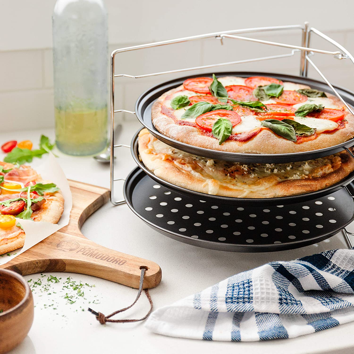 Chef Pomodoro Plaques à Pizzas Rondes Lot de 3 Moules à Pizza et 1 Grille de Support Plats à Pizzas pour