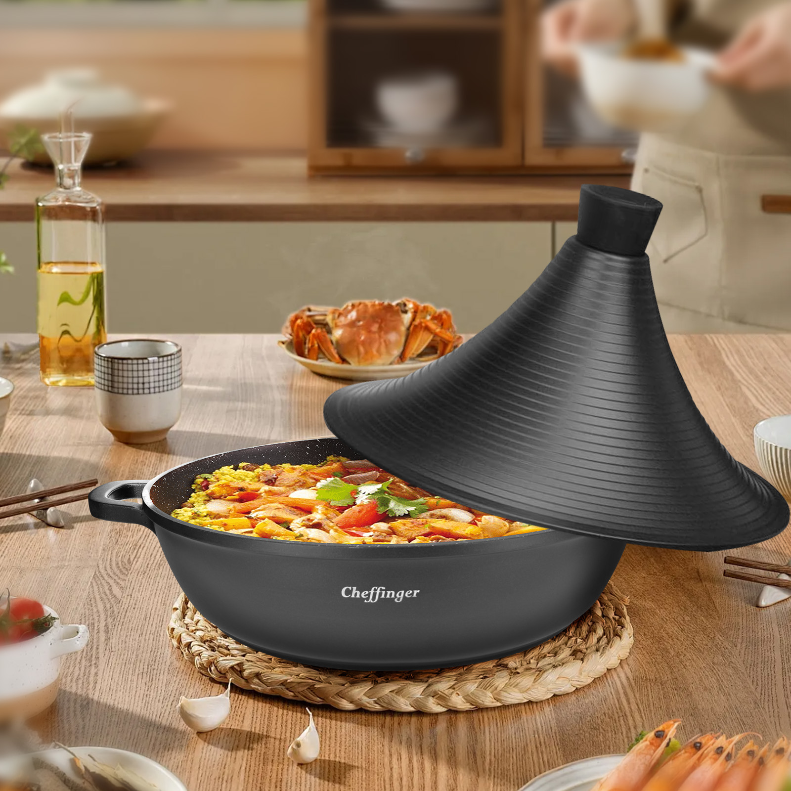 Plongez au cœur de la cuisine marocaine avec cette magnifique marmite à tajine de Cheffinger. Son revêtement intérieur antiadhésif de haute qualité permet facilite le démoulage et le nettoyage. Le couvercle conique concentre la vapeur pour une cuisson lente et douce, préservant ainsi toutes les saveurs de vos ingrédients. Les poignées ergonomiques offrent une prise en main sûre et confortable.