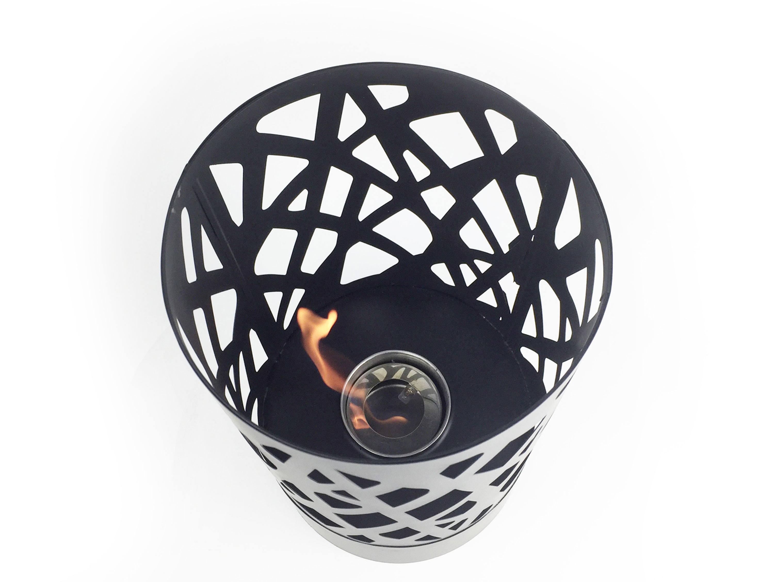 La cheminée AMALTEA ROUND est un modèle cylindrique en acier noir et se compose d'un corps allongé formé de lignes entrelacées. À l'intérieur se trouve une petite flamme qui produit jusqu'à 750 W de puissance de chauffage.