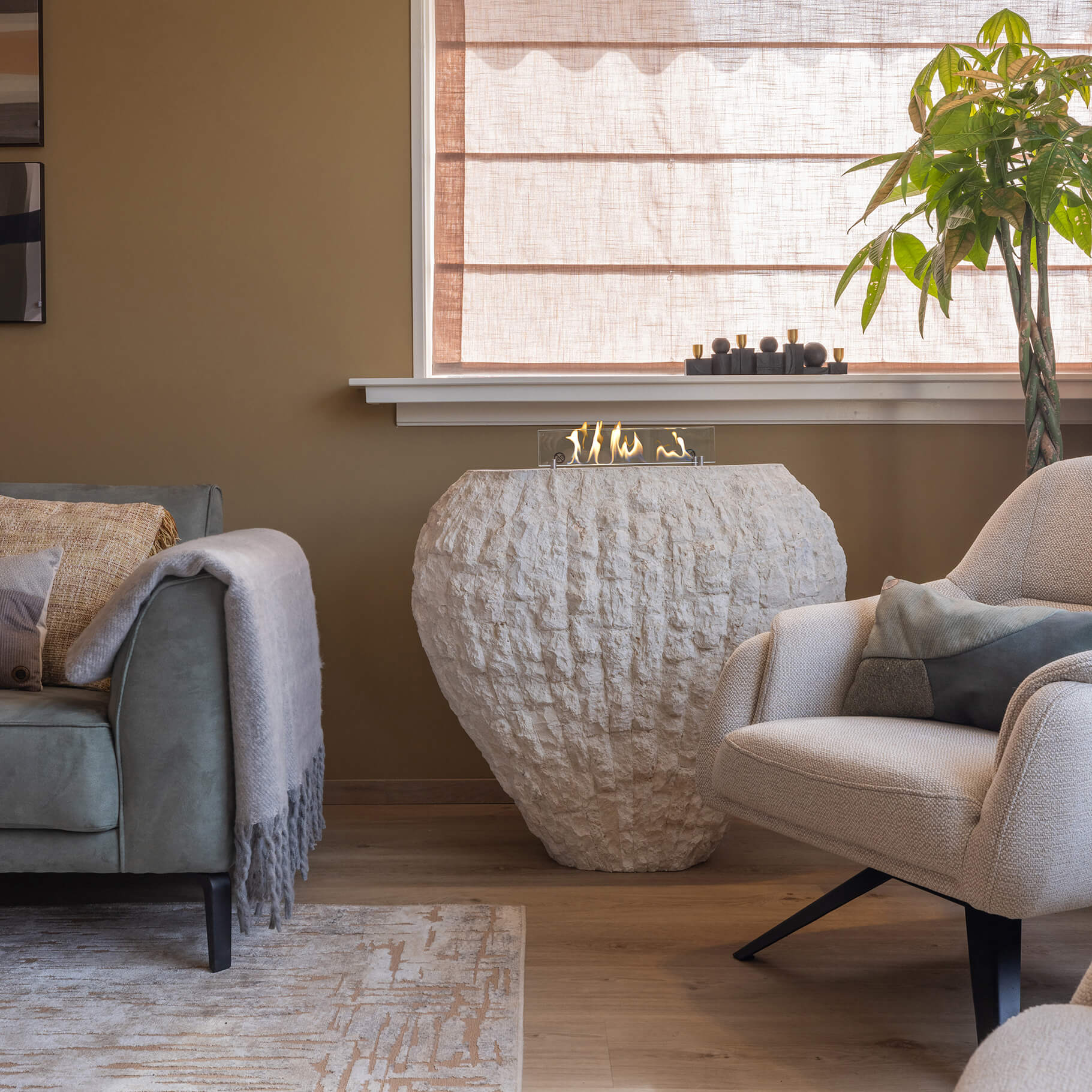 La cheminée autoportante Xaralyn Shigo est difficile à décrire. La cheminée Shigo est un vase en pierre naturelle combiné à un brûleur au bioéthanol. Un objet design qui peut être placé dans des intérieurs classiques ou modernes. Le Shigo est fabriqué en « pierre cassée ». Il s'agit d'un produit en pierre naturelle à l'aspect robuste. Avant utilisation, le Shigo doit être partiellement rempli de sable ou de cailloux afin d'alourdir la base du vase pour plus de stabilité (non inclus).