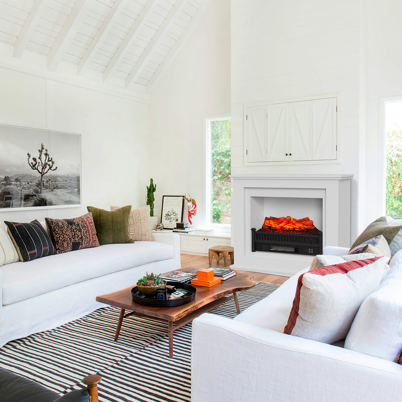 Profitez de votre maison avec la sensation de chaleur offerte par le kit de cheminée et d'habillage Bairon Fire Simulator. Son design extérieur en MDF blanc pur et ses lignes élégantes s'intègrent à toutes les tendances décoratives. Le simulateur de bûches a une puissance de 2000W qui chauffe rapidement la pièce grâce à sa sortie d'air frontale. Pour la faire fonctionner, il suffit de la brancher sur le réseau électrique. Il est possible de choisir seulement l'effet décoratif des flammes. Il est doté d'un écran tactile et d'une télécommande. Caractéristiques : - Utilisation : intérieur. - Dimensions du boîtier : 91,2x30x75 cm. - Dimensions du creux de la cheminée : 59x24x44 cm. - Matériau du revêtement : MDF. - Couleur : blanc pur. Caractéristiques de la cheminée : - Mesures : 58,4x32x22 cm. - Matériau : Structure en acier et décoration en résine. - Surface de chauffe : 10 à 15 m². - Puissance : 1800 - 2000 W. - Flamme : technologie LED à économie d'énergie. Luminosité réglable sur 3 niveaux. - Télécommande et minuterie : Oui, télécommande incluse. - Thermostat de sécurité : Oui. - Régulateur de puissance : réglable de 17 à 27 degrés Celsius. - Prise de courant 220-240V. *Interdit de placer près des salles de bains, douches ou piscines, ne pas couvrir. Installer à au moins un mètre des meubles, murs ou sols (ne pas utiliser de produits de nettoyage). **Se placer à une hauteur de 30-60 cm du soleil et à une distance minimale de 100 cm du haut du plafond.