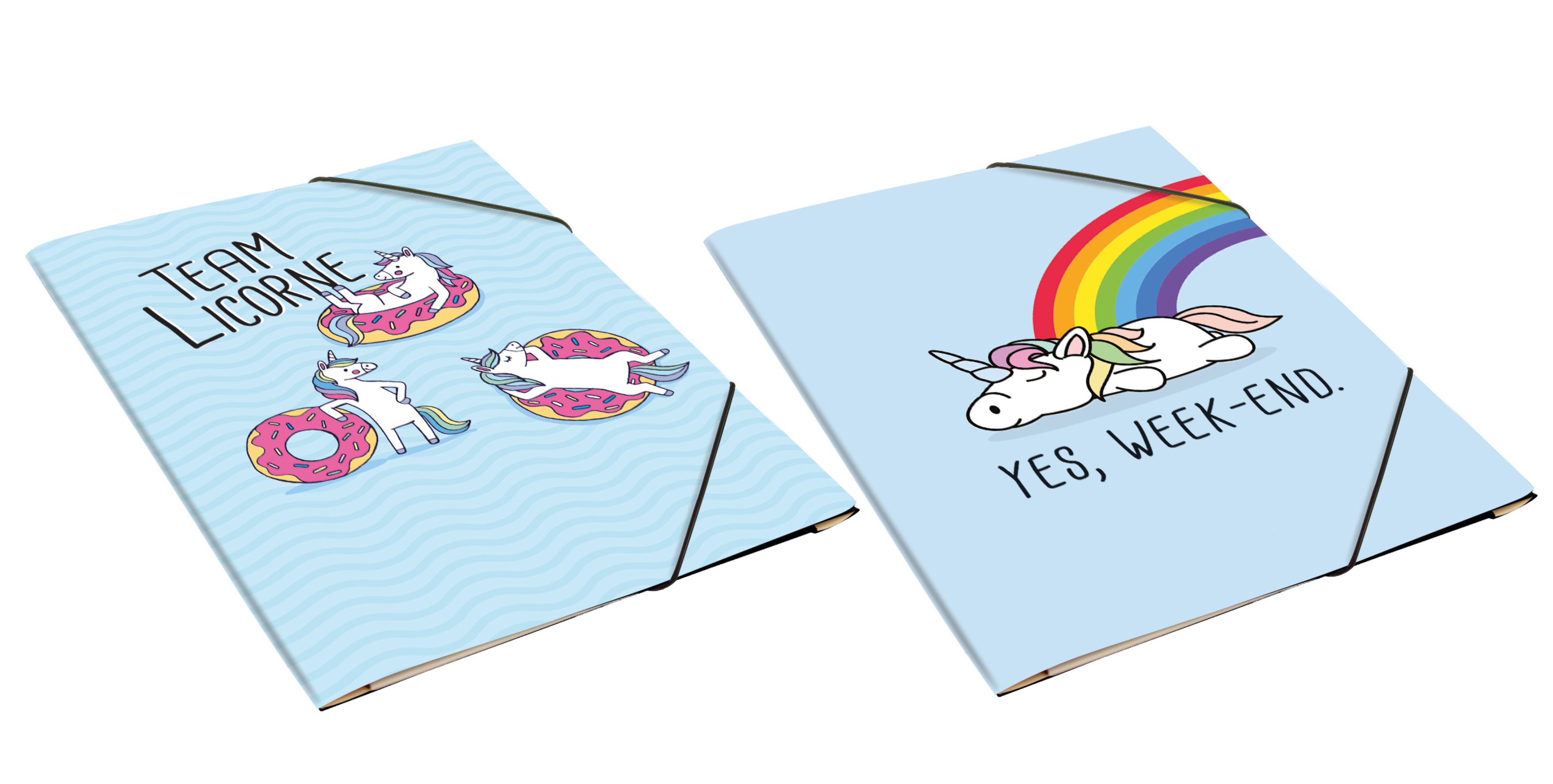 Chemise 3 rabats carton avec élastique format 24x32 cm décor licorne