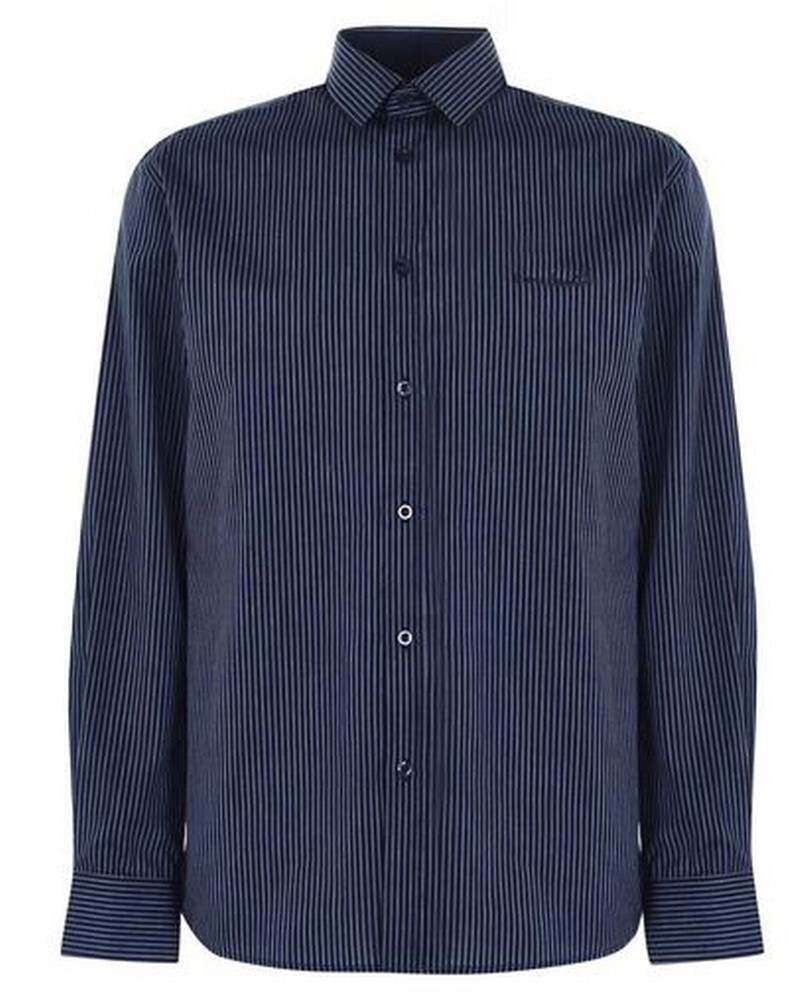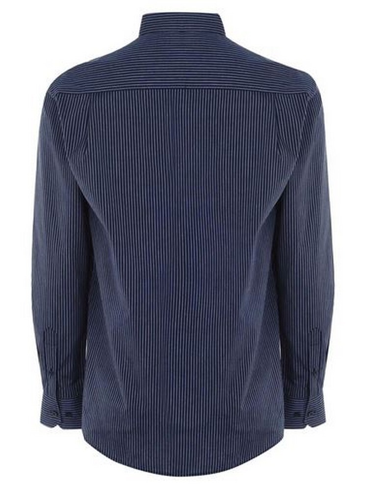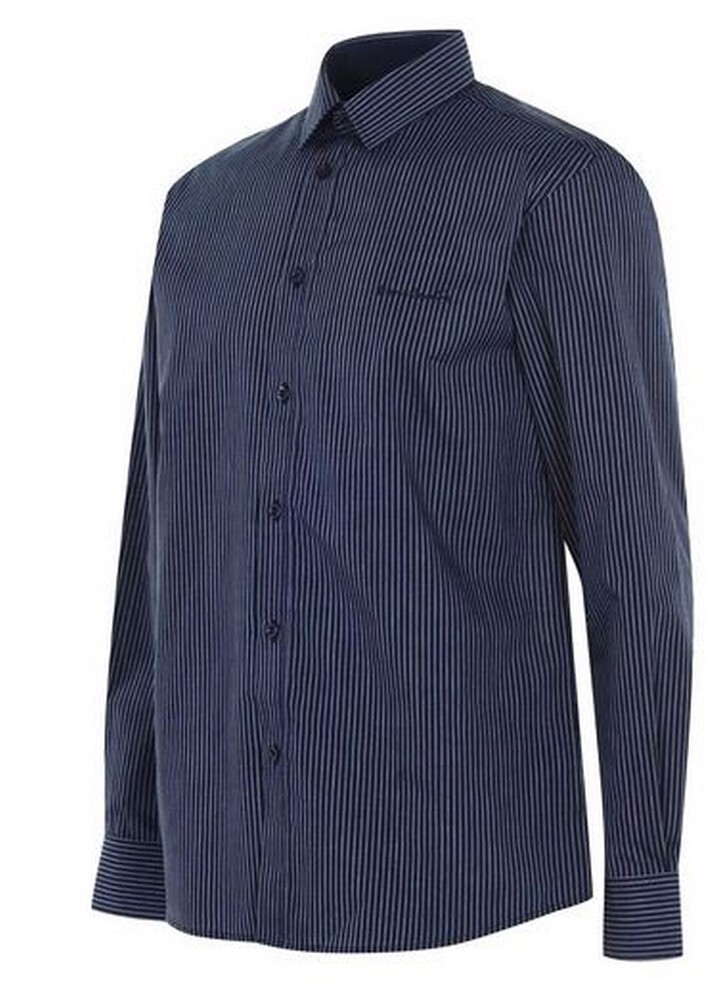 Chemise homme Pierre Cardin bleu marine rayée blanc Manches longues Coupe classique Boutons aux poignets 65 % polyester, 35 % coton Lavable en machine