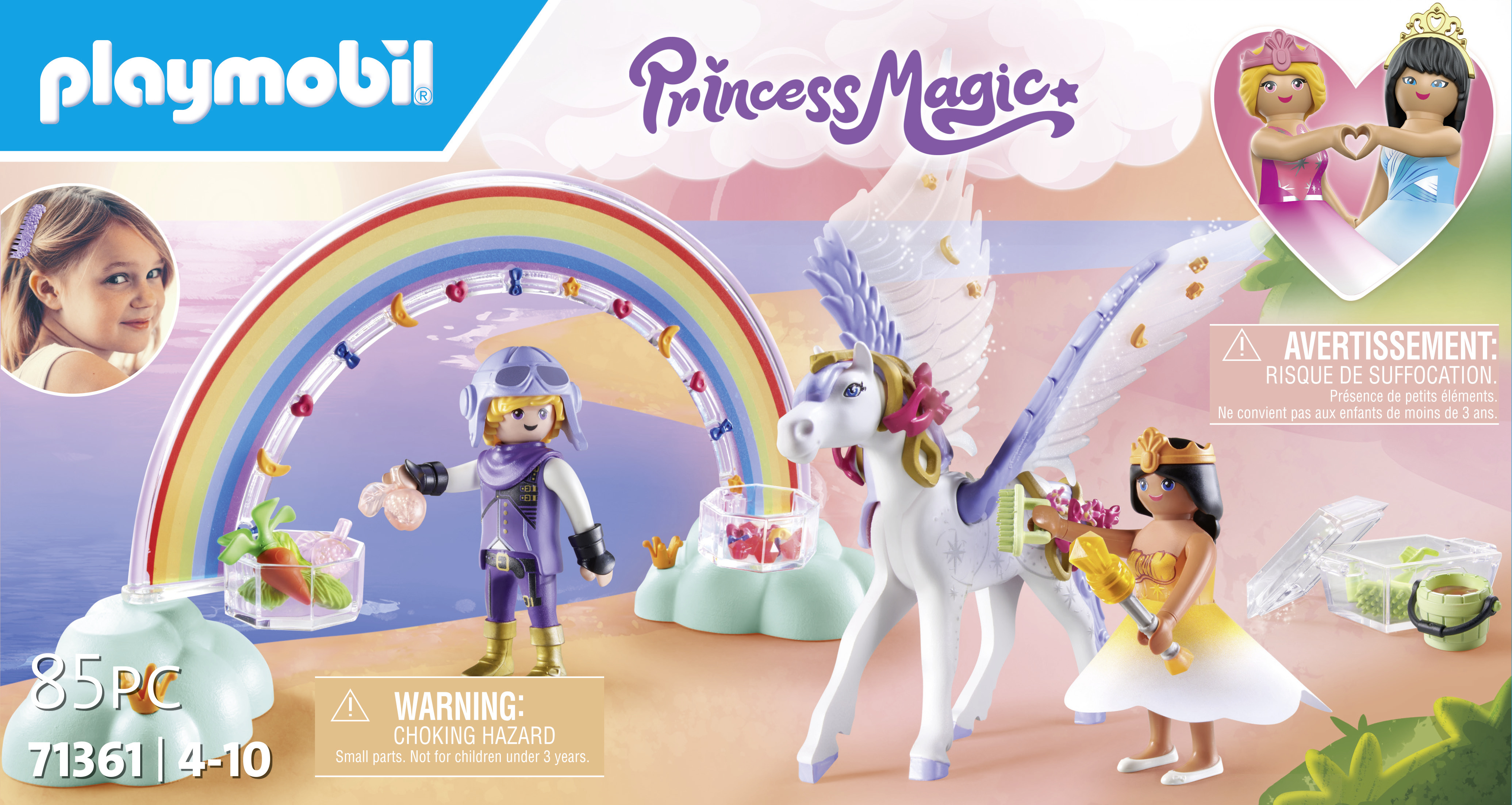 La princesse et le chevalier s’occupent du cheval ailé sous l’arc en ciel magique. Comprend une princesse, un chevalier, un pégase, un arc en ciel magique et des accessoires de décoration.