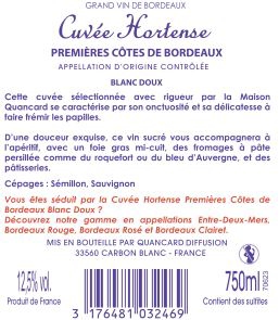 | Libellé | Cheval Quancard Cuvée Hortense, 2020 - Premières Côtes de Bordeaux AOC - Blanc Moelleux - 75 cl |