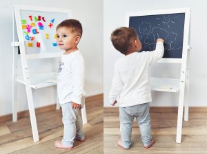 Offrez à votre petit artiste en herbe le cadeau parfait avec ce chevalet en bois magnétique à double face ! Mesurant 98 x 52 cm et réglable en hauteur, il est parfait pour dessiner, écrire des lettres et des chiffres, ou simplement s'amuser à travailler sur un tableau. Les deux faces du tableau sont déjà montées, avec une face noire à craie et une face magnétique effaçable à sec pour écrire avec un marqueur. Le chevalet est livré avec une éponge, de la craie et des lettres magnétiques pour encore plus de plaisir et d'apprentissage. Les pieds détachables permettent de poser la planche sur un bureau, et la grande étagère pratique offre un espace de rangement pour le matériel. Le chevalet est également sûr pour les enfants, avec des peintures non toxiques et aucune arête vive. Achetez ce jouet en bois durable et esthétique pour votre enfant et aidez-le à apprendre à respecter l'environnement. Convient aux enfants de 3 à 6 ans.