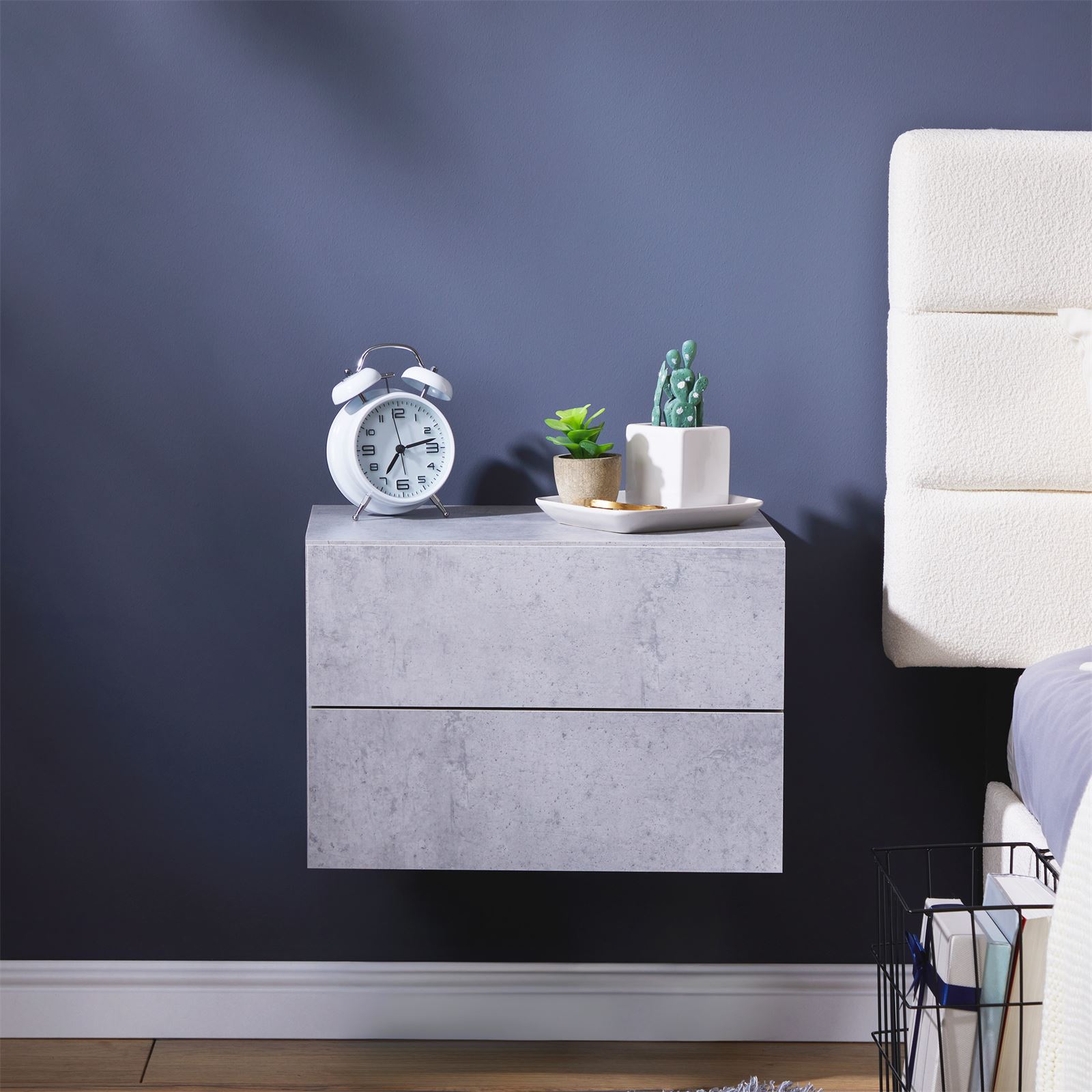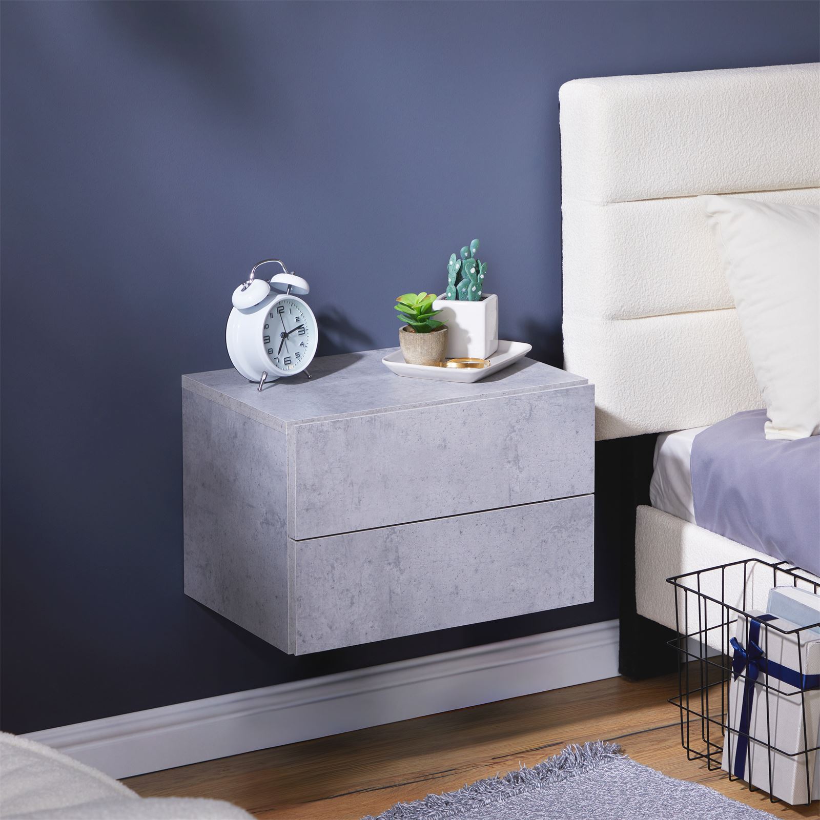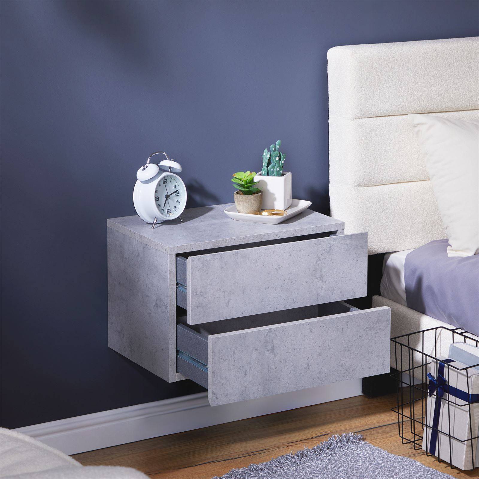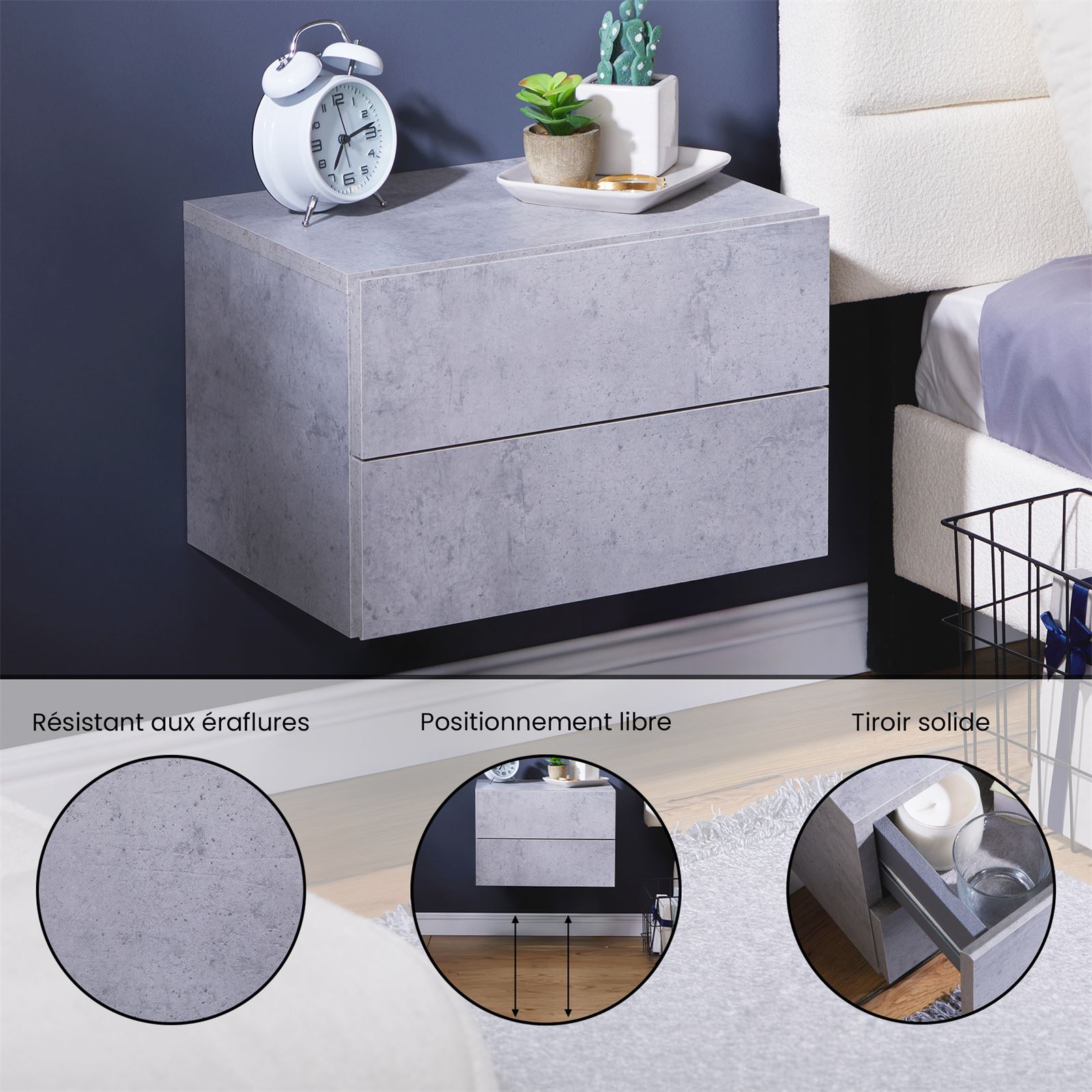 | Libellé | Chevet suspendu FLORENT, étagère murale avec 2 tiroirs sans poignée, en mélaminé décor béton |