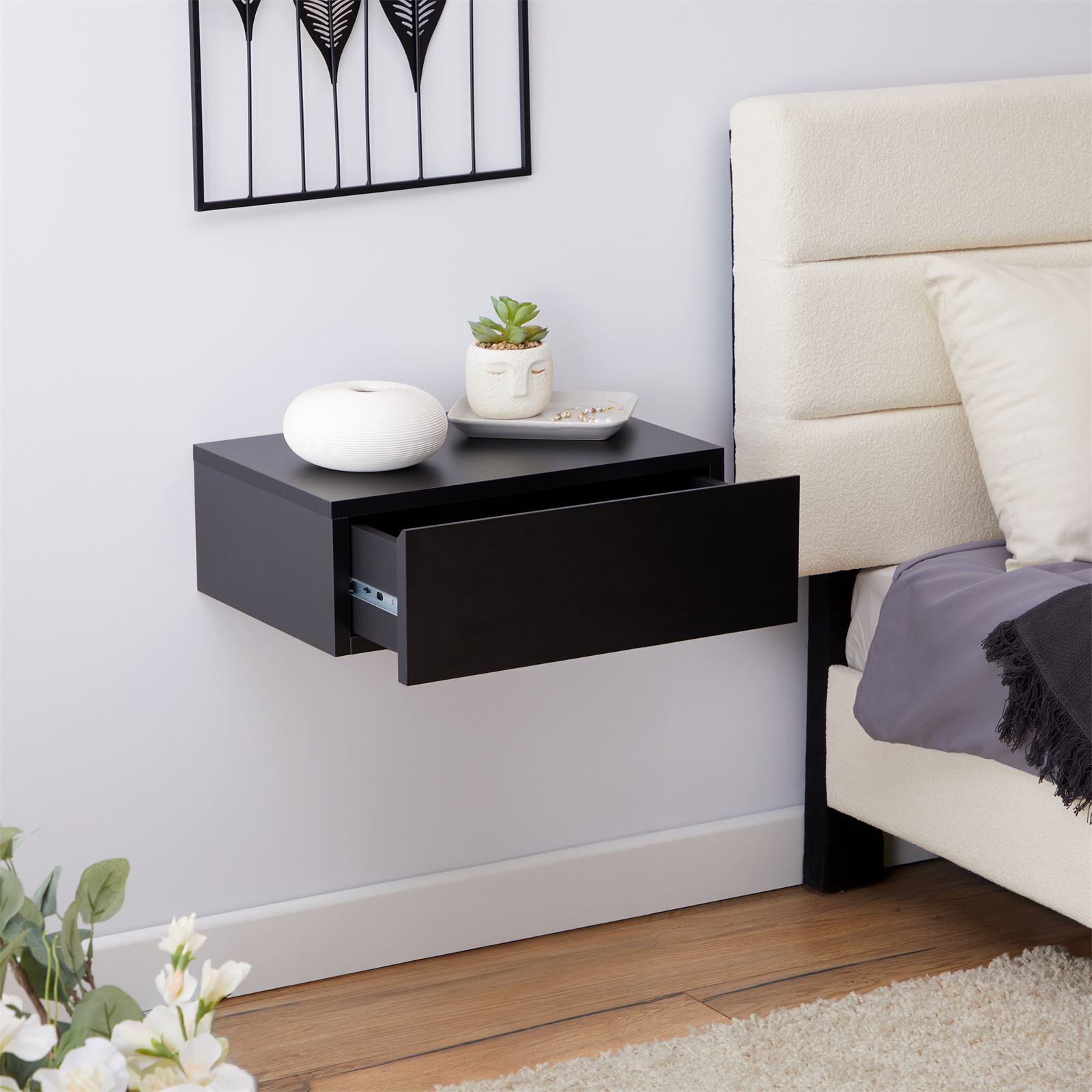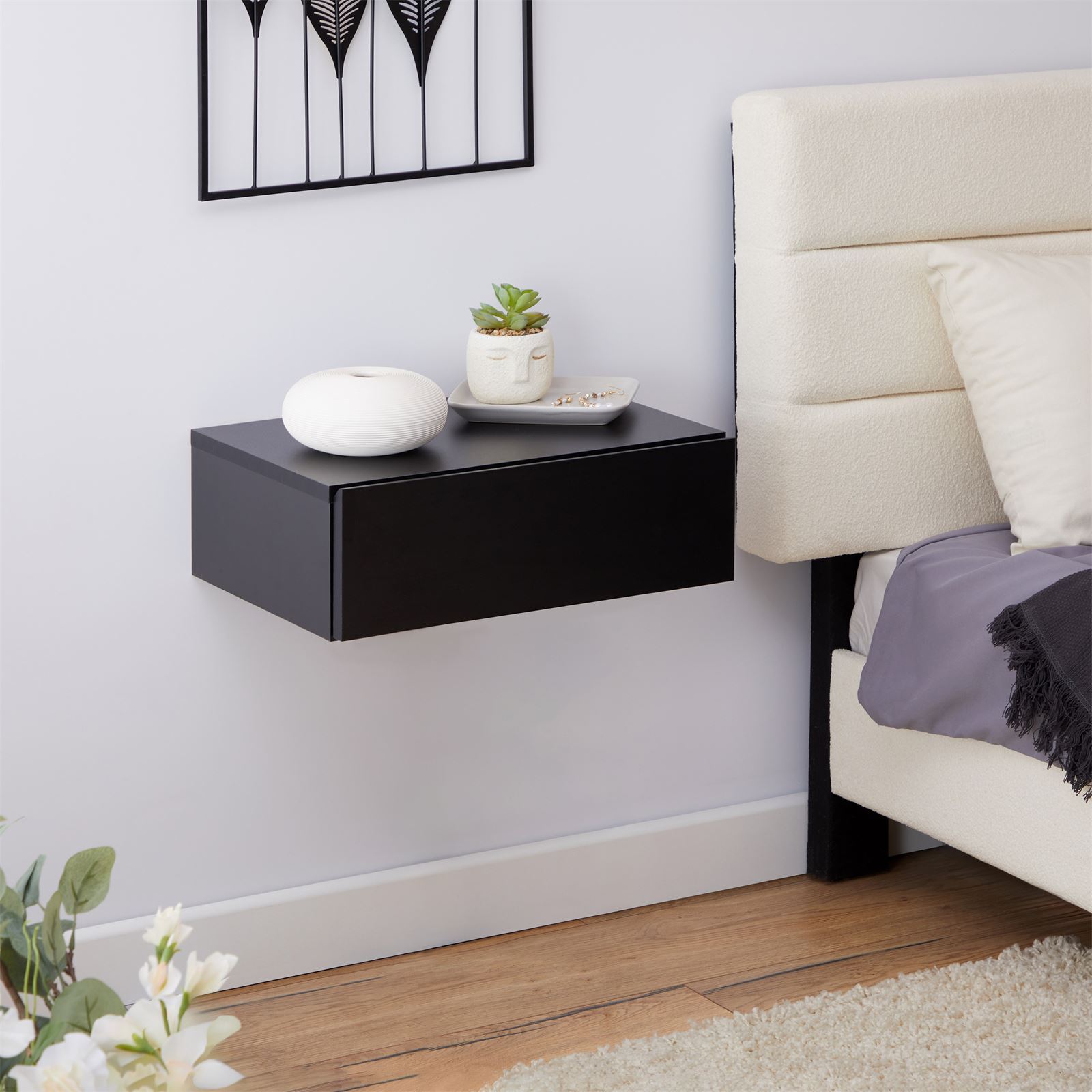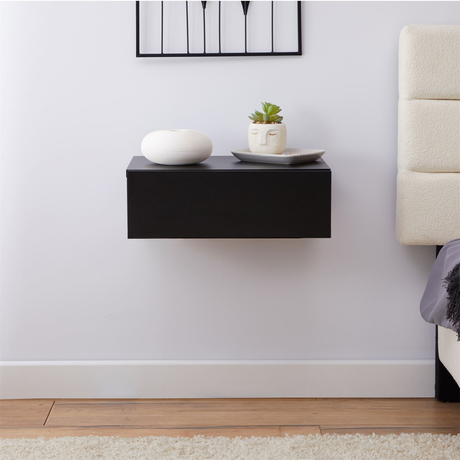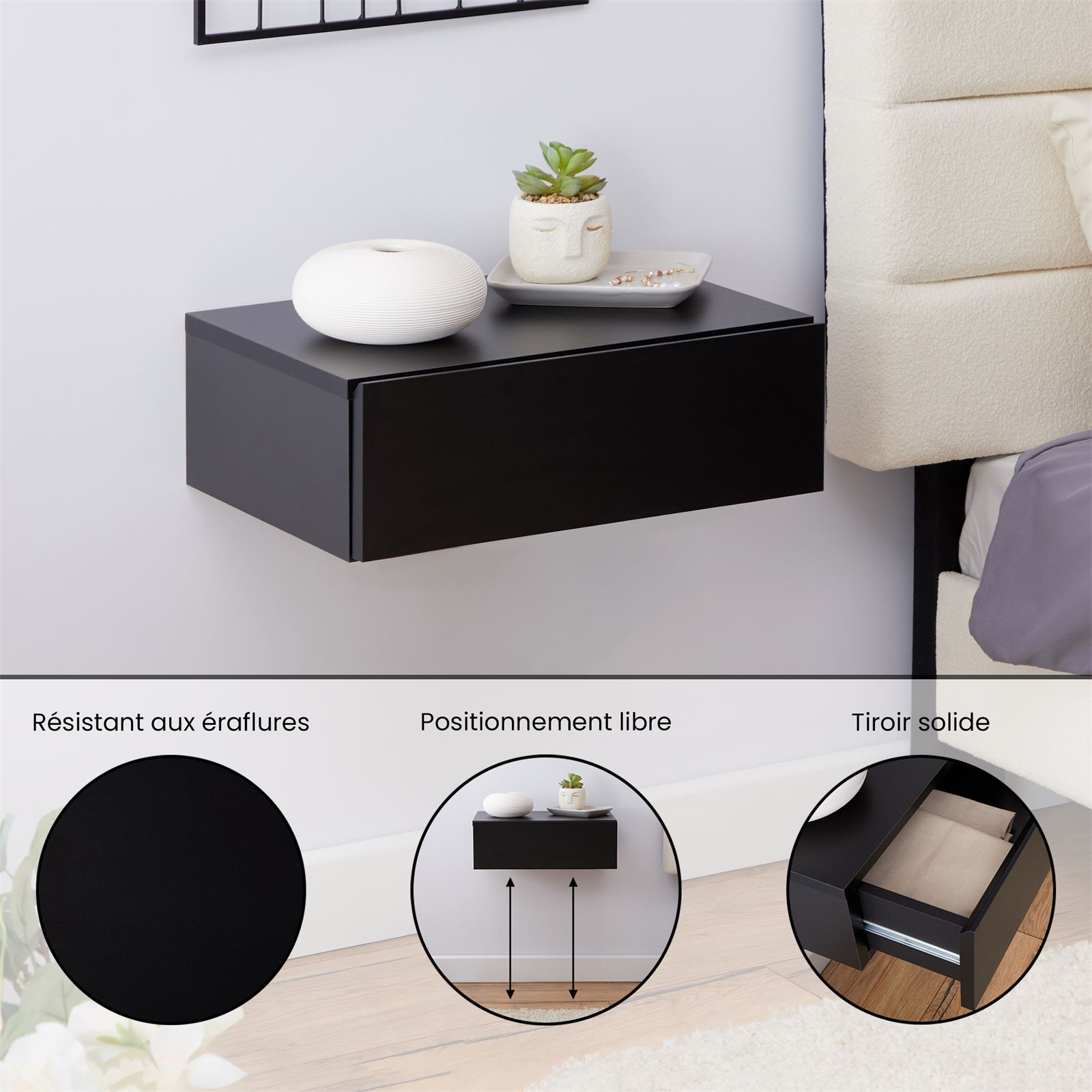 | Libellé | Chevet suspendu OCEANE, étagère murale avec 1 tiroir sans poignée, en mélaminé noir mat |