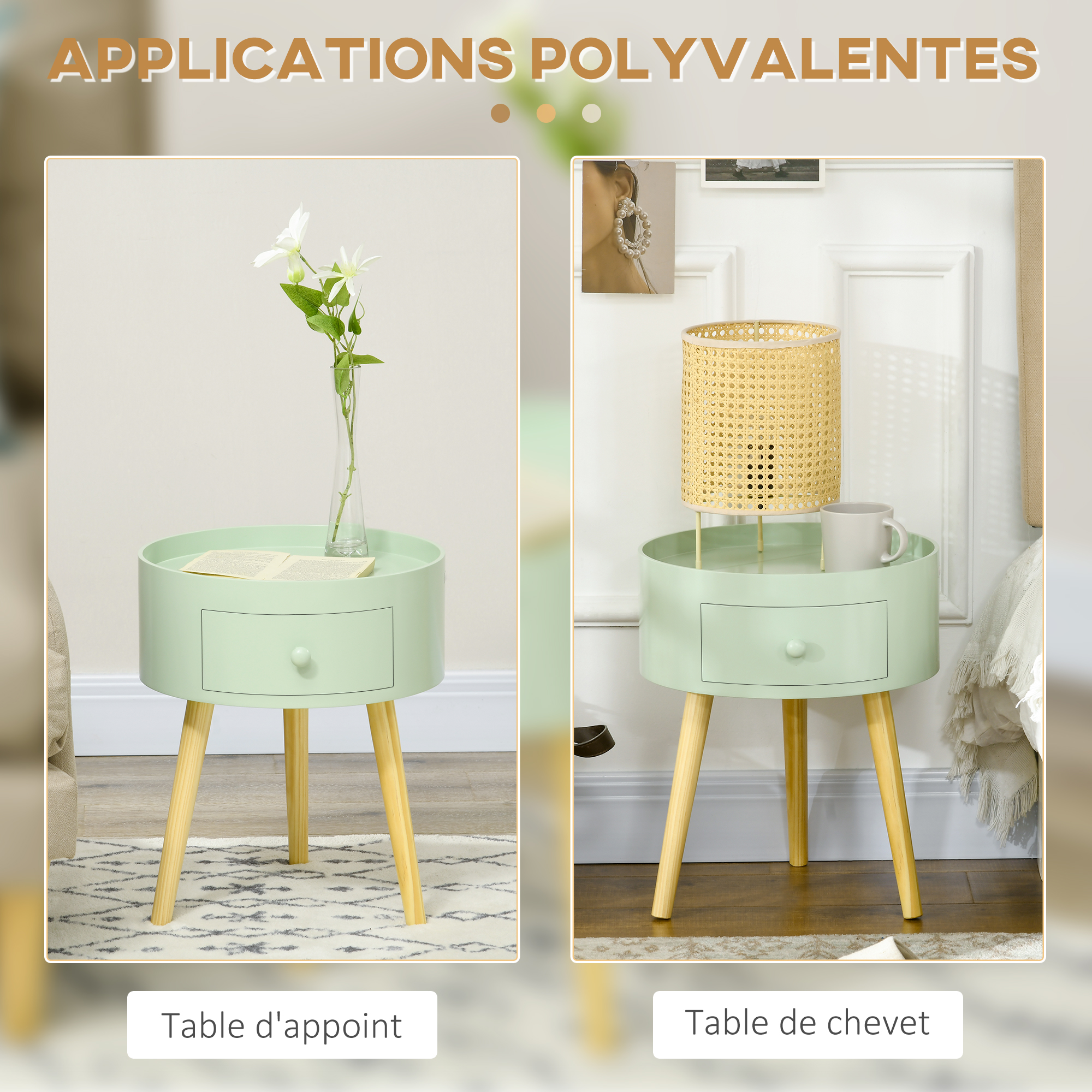 | Libellé | Chevet table de nuit ronde design scandinave tiroir bicolore pieds effilés inclinés bois massif chêne clair vert |