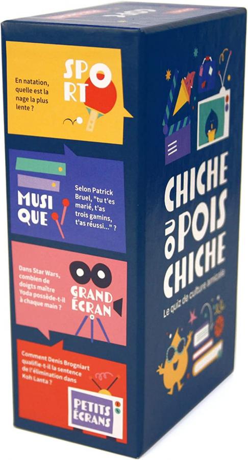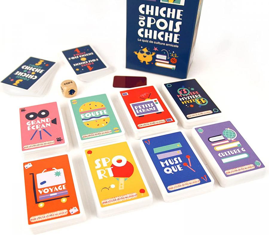A mi-chemin entre jeu de questions-réponses et jeu d'ambiance, Chiche ou Pois Chiche est un jeu où les bonnes réponses sont loin de suffire pour l'emporter ! Il faudra compter sur la connaissance de votre partenaire, sur une bonne touche d'audace et sur votre curiosité du quotidien pour l'emporter en équipe. A Chiche ou Pois Chiche, c'est pas forcément le premier de la classe qui l'emporte. But du jeu: Gagner un maximum de points en posant les bonnes questions à votre (vos) partenaire(s) de jeu. Mieux vous connaissez votre (vos) partenaire(s), mieux vous choisirez les questions auxquelles il(s) peut (peuvent) répondre, plus vous aurez de chances de marquer des points et de l'emporter. Déroulement du jeu: A chaque tour, le joueur qui a la main peut décider de jouer une carte de son propre jeu, dont il connaît l'énoncé, ou de tirer une carte chez un adversaire, dont il ne connaît que la thématique. Puis il énonce un indice sur la question à son partenaire, qui répond ""Chiche"" s'il pense pouvoir répondre ou ""Pois Chiche"" s'il a besoin de propositions de réponses pour s'en sortir. A cela s'ajoute le dé qui viendra lui simplifier ou lui compliquer la tâche.