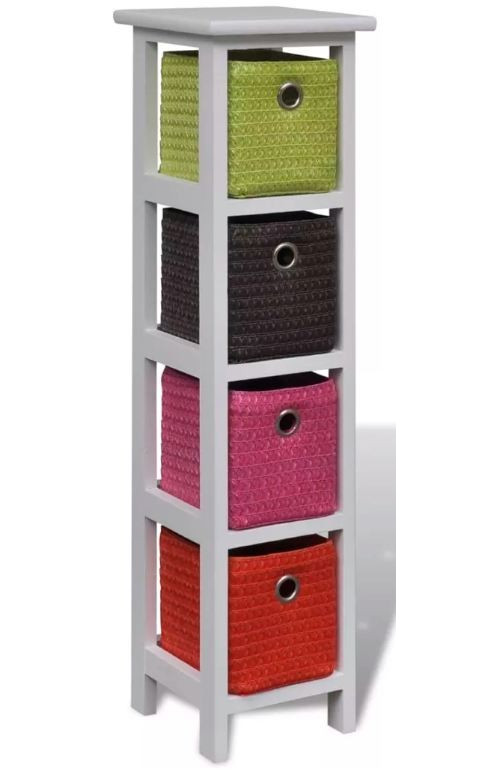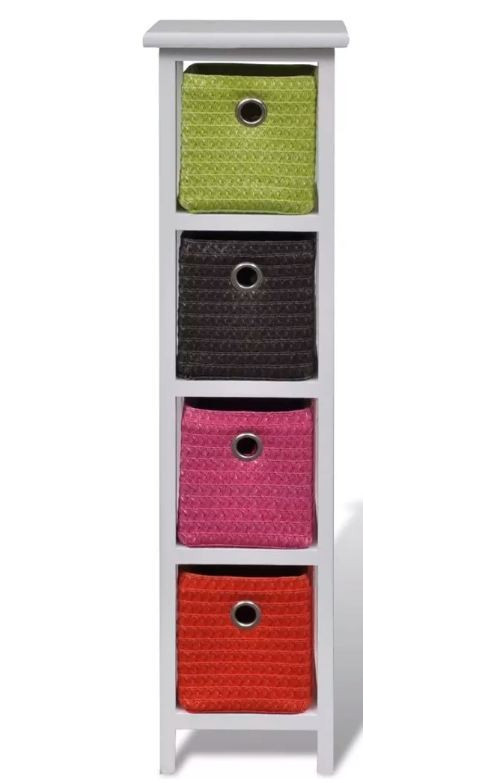 Ce très beau chiffonnier de la collection Finess apportera de la couleur dans votre intérieur. Il dispose de 4 tiroirs multicolore de rangement et sur son plateau vous pouvez mettre des objets décoratifs. Cet article est également disponible en d'autres dimensions. D'autres meubles du même style peuvent s'harmoniser pour créer une décoration harmonieuse. Dimensions : L 20 x H 80 x P 20 cm Dimensions des tiroirs : L 16 x H 15 x P 14 cm Couleur : Blanc Matériau : Bois massif et MDF Matériel : Polypropylène 100% Equipements : 4 tiroirs multicolore