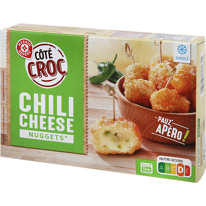 Bouchées garnies d'une farce (46,1 %) à base de cheddar, poivron et piment jalapeño, enrobées d'une panure (53,9 %), pré-frites, surgelées COTE CROC