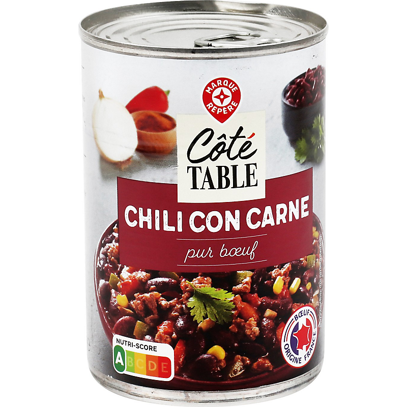 | Origine des principaux ingrédients | BOEUF ORIGINE : FRANCE, HARICOT ROUGE ORIGINE : AMERIQUE, ASIE ET/OU EUROPE*, PIMENT DE CAYENNE: AMERIQUE, ASIE ET/OU EUROPE* * SELON LES APPROVISIONNEMENTS ET/OU LES CARACTÉRISTIQUES GUSTATIVES RECHERCHÉES |
