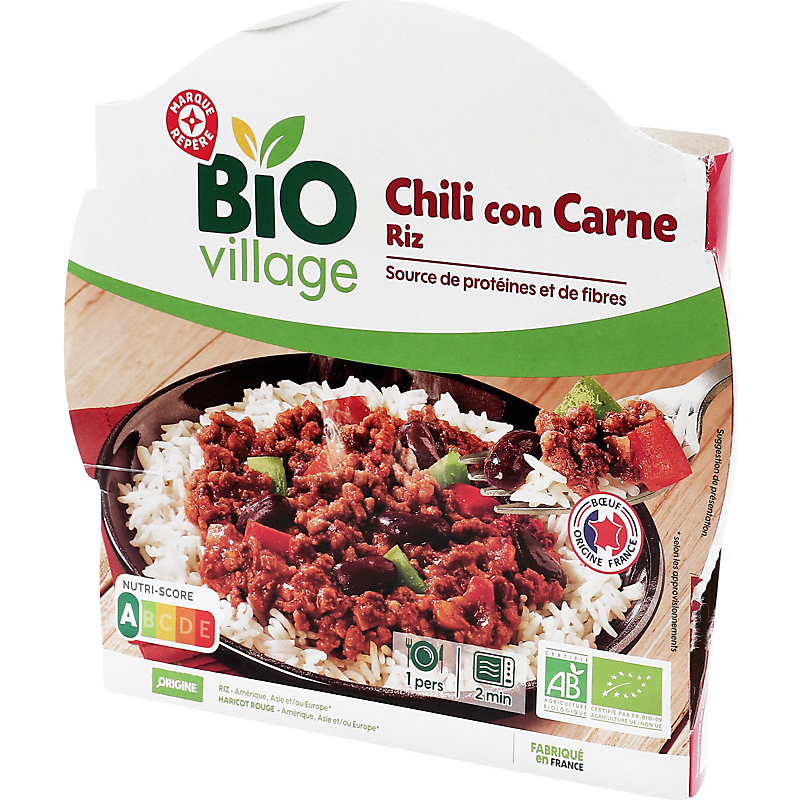Chili con carne accompagné de riz – Produit issu de l’agriculture biologique BIO VILLAGE