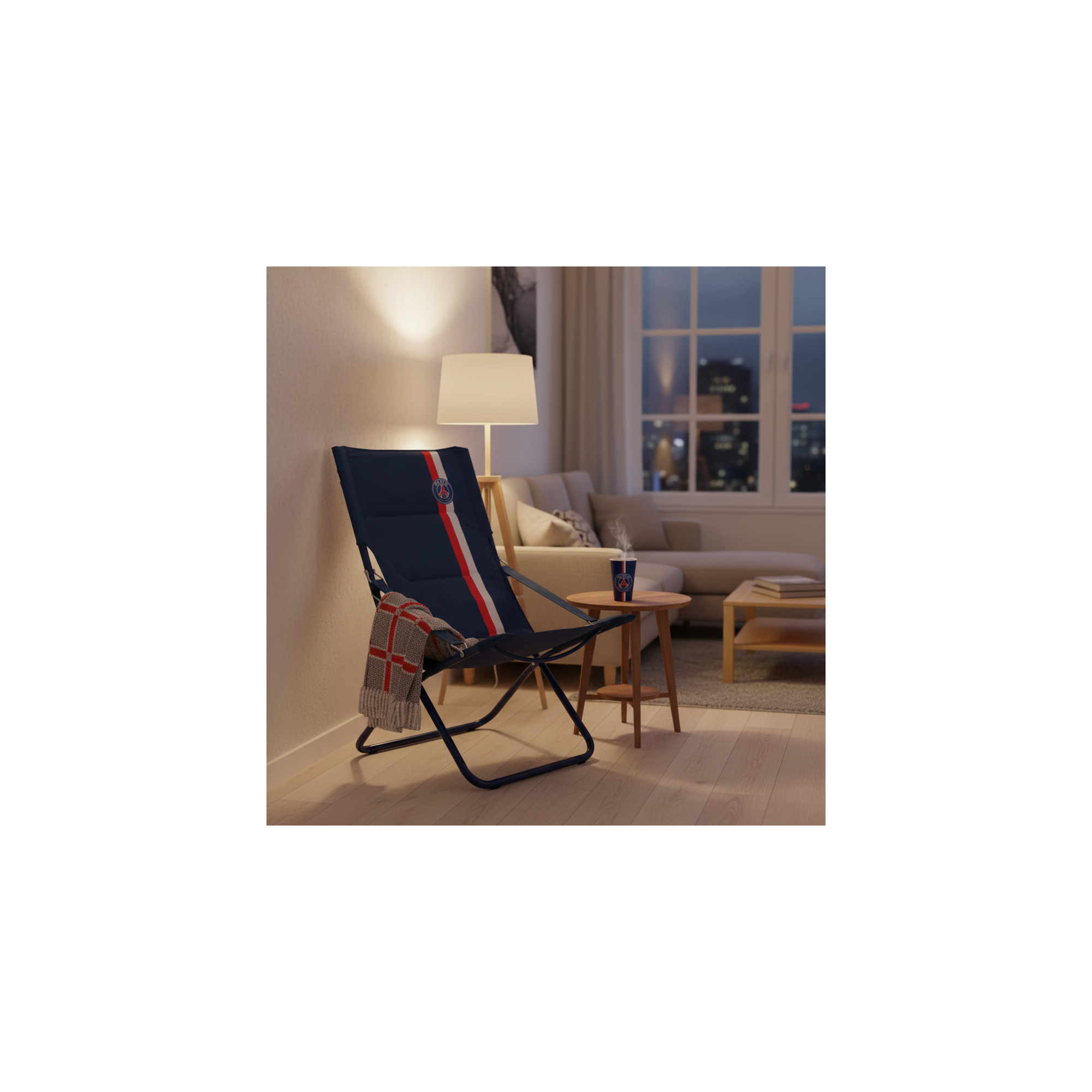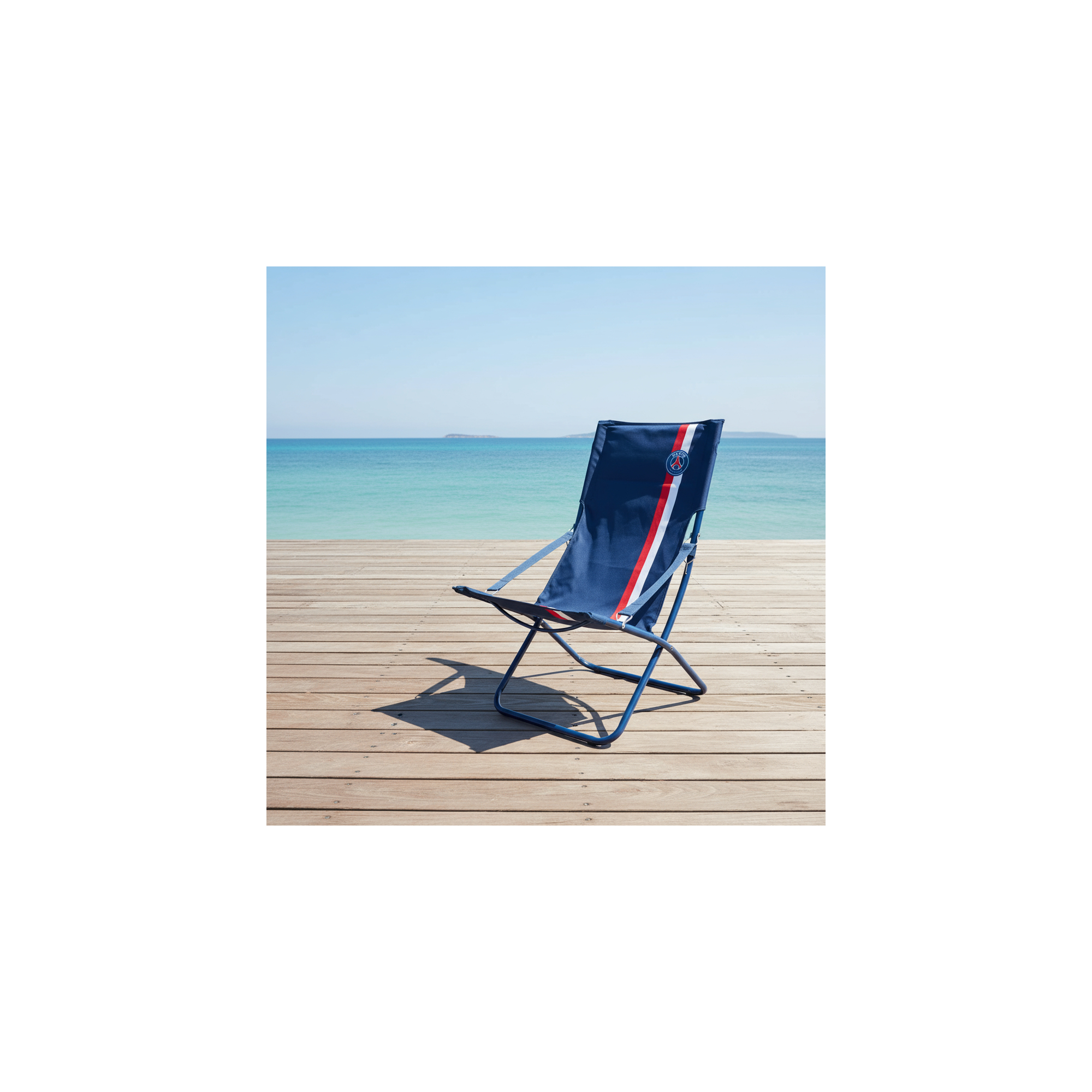 Chilienne sous Licence Officielle Paris Saint-Germain (PSG) Idéale pour se reposer que ce soit en intérieur ou au soleil. Sangles réglables sur différentes positions selon la position recherchée. Assise confortable et douce. Pliable pour gain de place lors du rangement. Caractéristiques Dimensions : 40 x 48 x 102 cm Couleur : Rouge et Bleu Paris Saint Germain. #championdeFrance.