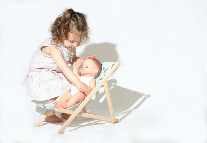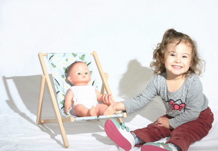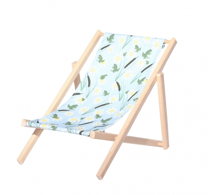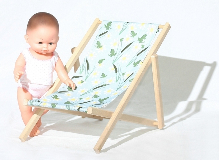 Cette chaise longue pour poupées est la version mini de la chilienne enfant de la collection Paulette et Sacha. Fabriquée en France, elle conviendra à toutes les tailles de poupées jusqu'à 50 cm (taille de la poupée sur les photos : 36 cm) Sa structure en bois de hêtre juste poncé résistera aux intempéries, mais il est conseillé de rentrer la chaise après usage pour en garder toute sa beauté. La toile est imprimée motif grenouilles sur fond bleu devant et blanche au dos. Elle résiste aux UV et intempéries. Motif imprimé Grenouilles ou Fraises avec encres non-toxiques. Certificat Oekotex. Elle n'est pas démontable, pour le nettoyage utiliser une éponge et de l'eau. Pour les tâches les plus sévères, un produit nettoyant pour textile. Le fil utilisé pour la couture de cette toile est aussi résistant aux UV et intempéries pour garder toute sa blancheur et sa tenue dans le temps. Livré montée. Ne se replie pas.