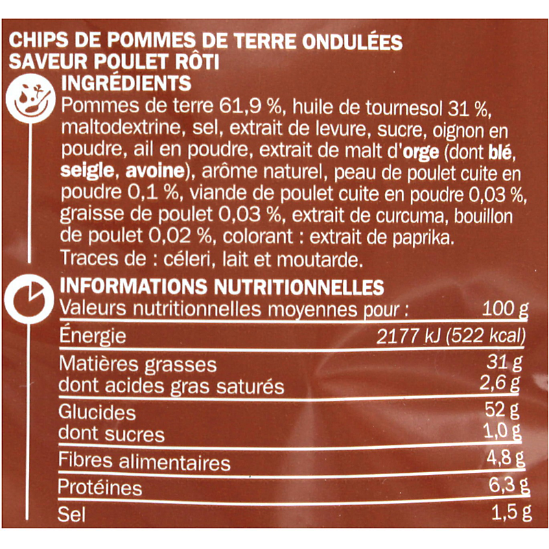 Ingrédients: Pommes de terre 61,9 %, huile de tournesol 31 %, maltodextrine, sel, extrait de levure, sucre, oignon en poudre, ail en poudre, extrait de malt d'orge (dont blé, seigle, avoine), arôme naturel, peau de poulet cuite en poudre 0,1 %, viande de poulet cuite en poudre 0,03 %, graisse de poulet 0,03 %, extrait de curcuma, bouillon de poulet 0,02 %, colorant : extrait de paprika.