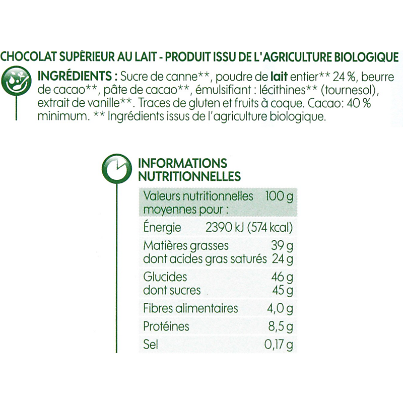 Ingrédients : Sucre de canne**, poudre de lait entier** 24,8 %, beurre de cacao**, pâte de cacao**, émulsifiant : lécithines** (tournesol), extrait de vanille**.