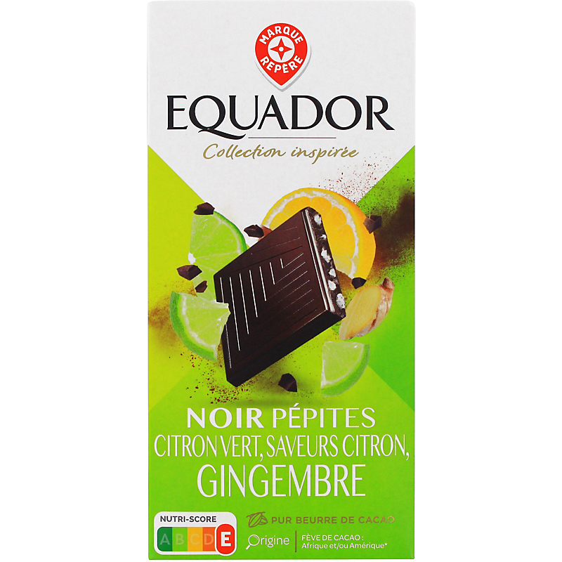 Chocolat noir aux pépites de citron vert (4 %), aromatisé au citron et au gingembre EQUADOR