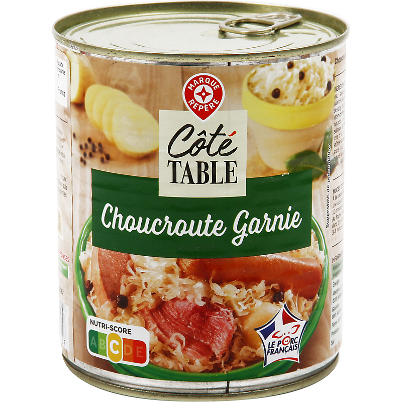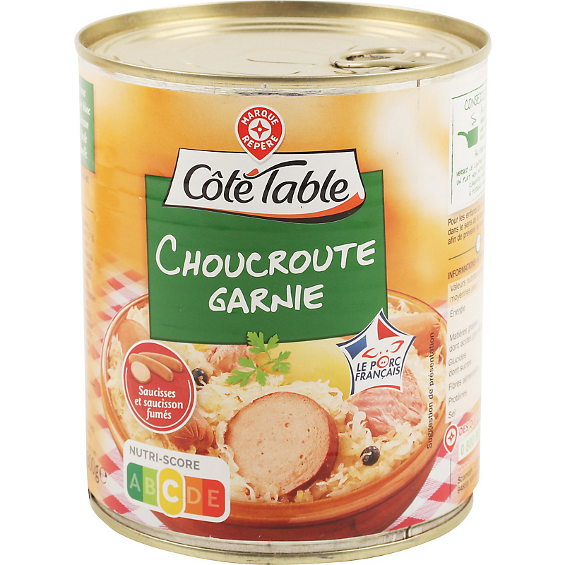 Ingrédients: Choucroute 47,5 % (chou blanc ; sel) ; eau ; saucisses et saucissons pur porc fumés 16,2 % (viande de porc ; pièces de tête de porc ; eau ; protéines de sang de porc ; farine de blé ; sel ; couenne de porc déshydratée ; gras de porc ; protéines de pois ; arômes naturels ; arômes de fumée) ; viande de porc traitée en salaison 6,2 % (viande de porc ; eau ; sel) ; pommes de terre 5 % ; vin blanc ; saindoux ; sel ; arômes naturels ; arôme naturel de vin blanc ; baies de genièvre ; poivre en grains 0,03 % ; antioxydant : acide ascorbique ; arôme naturel de cumin ; arôme naturel d'ail ; arôme naturel de poivre ; arôme naturel de coriandre.