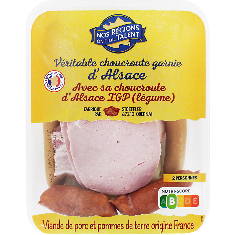 Ingrédients : Choucroute d'Alsace IGP (légume) cuisinée 54 % [choucroute, bouillon (jus de cuisson, arôme naturel), saindoux, vin blanc d'Alsace (riesling) 1,2%, sel, baies de genièvre, antioxydant : acide ascorbique, laurier], pommes de terre cuites 13 % (pommes de terre, eau, sel), knacks supérieures fumées (viande de porc 8,9 % ; eau ; gras de porc ; sel ; plasma de porc déshydraté ; épices et plantes aromatiques ; arômes naturels ; dextrose ; antioxydants : acide ascorbique, ascorbate de sodium ; conservateur : nitrite de sodium ; boyau naturel de mouton), saucisses fumées cuites (viande de porc 8,1 %, eau, sel, arômes naturels, dextrose, épices et plantes aromatiques, antioxydant : acide ascorbique, sucre, conservateur : nitrite de sodium, poireaux, boyau naturel de porc), filet de porc cuit fumé [filet de porc 5,8 %, eau, sel, arômes naturels, dextrose, plantes aromatiques, sucre, bouillon de légumes déshydraté (carottes, poireaux, livèche, plantes aromatiques), antioxydant : ascorbate de sodium, conservateur : nitrite de sodium], poitrine fumée cuite (poitrine de porc 5 %, eau, sel, dextrose, antioxydant : ascorbate de sodium, conservateur : nitrite de sodium).​​​​