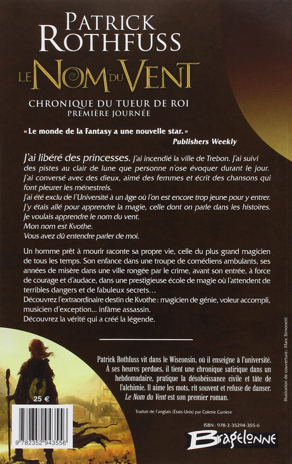 « Patrick Rothfuss se propulse au premier rang des auteurs de fantasy avec ce fabuleux premier roman qui pourrait fort bien se passer de mes éloges. Jordan et Goodkind doivent commencer à regarder nerveusement par-dessus leur épaule ! »  Kevin J.Anderson