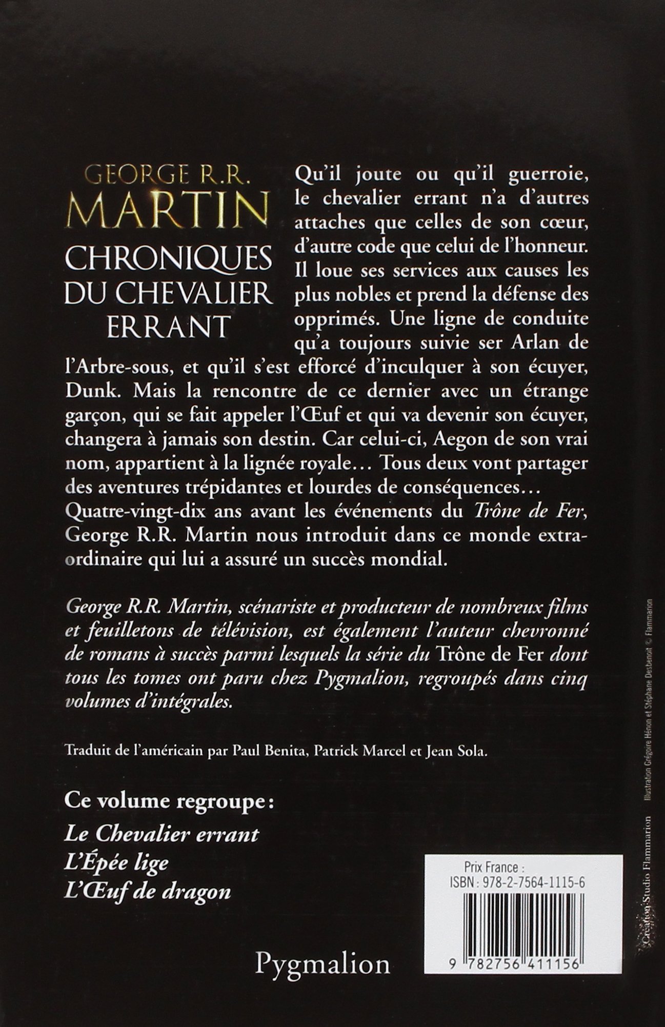 Qu'il joute ou qu'il guerroie, le chevalier errant n'a d'autres attaches que celles de son coeur, d'autre code que celui de l'honneur. Il loue ses services aux causes les plus nobles et prend la défense des opprimés. Une ligne de conduite qu'à toujours suivie ser Arlan de l'Arbre-sous, et qu'il s'est efforcé d'inculquer à son écuyer, Dunk. Mais la rencontre de ce dernier avec un étrange garçon, qui se fait appeler l'Oeuf et qui va devenir son écuyer, changera à jamais son destin. Car celui-ci, Aegon de son vrai nom, appartient à la lignée royale... Tous deux vont partager des aventures trépidantes et lourdes de conséquences... Quatre-vingt-dix ans avant les événements du Trône de Fer, George R.R. Martin nous introduit dans ce monde extraordinaire qui lui a assuré un succès mondial.