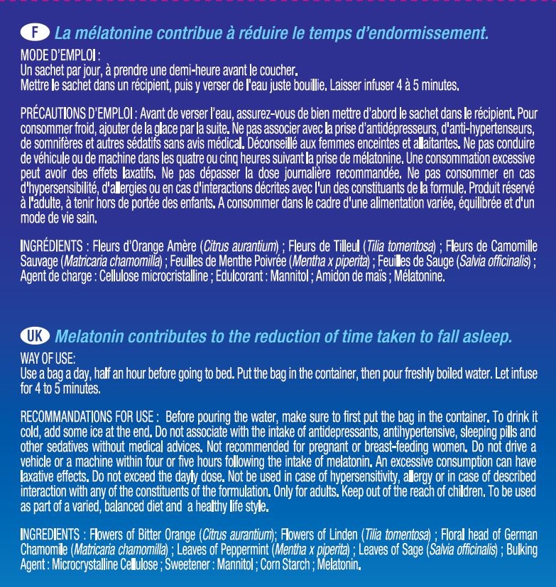 Ingrédients : fleurs d’orange amère (Citrus aurantium) ; fleurs de tilleul (Tilia tomentosa); fleurs de camomille sauvage (Matricaria chamomilla) ; feuilles de menthe poivrée (Mentha x piperita); feuilles de sauge (Salvia officinalis); agent de charge: cellulose microcristalline; édulcorant: mannitol; amidon de maïs; mélatonine.