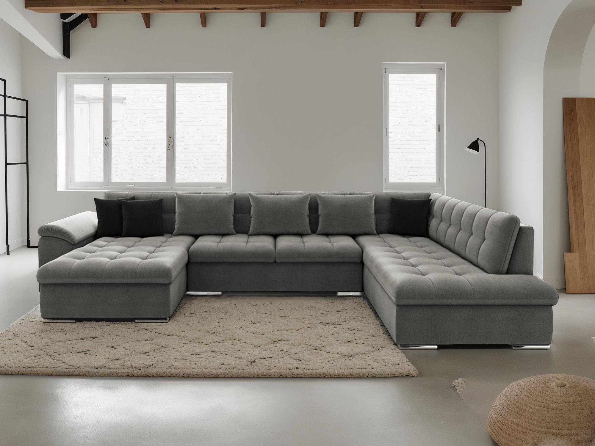 | Plus produit | [Chuck – canapé panoramique XXL droit] Grand canapé 7 places, parfait pour salons spacieux et accueil de vos proches. [Convertible XXL] Transformez-le en literie généreuse sur simple manipulation, confort moelleux garanti. [Coffre XXL intégré] Espace de stockage extra-large sous assise, idéal pour couettes et plaids. [Structure robuste] Ossature bois massif et pieds en métal, pour une stabilité durable et un style industriel affirmé. [Garantie 2 ans] Profitez de votre canapé en toute confiance avec une garantie de 2 ans. |
