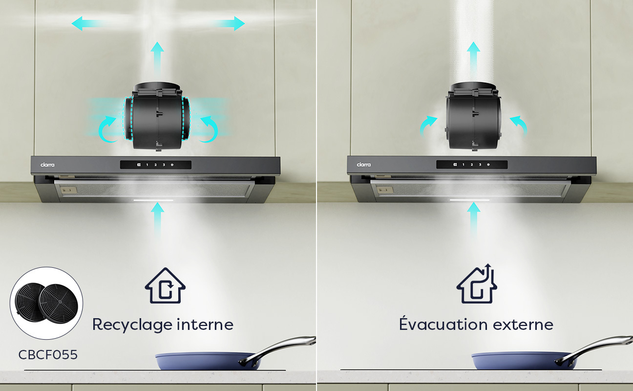 Conseil d’entretien: Pour garantir des performances optimales, remplacez les filtres à charbon tous les 2 à 4 mois et nettoyez les filtres à graisse toutes les 2 à 3 semaines.