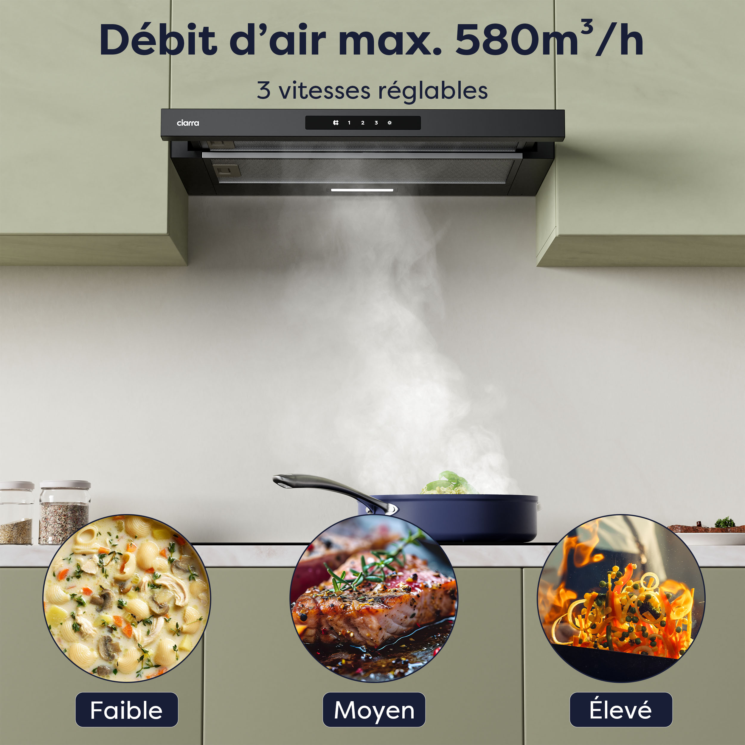 3 Vitesses et aspiration puissante:Avec une capacité d'aspiration maximale de 580 m³/h, elle élimine efficacement les fumées et les odeurs, garantissant un air pur dans votre cuisine.