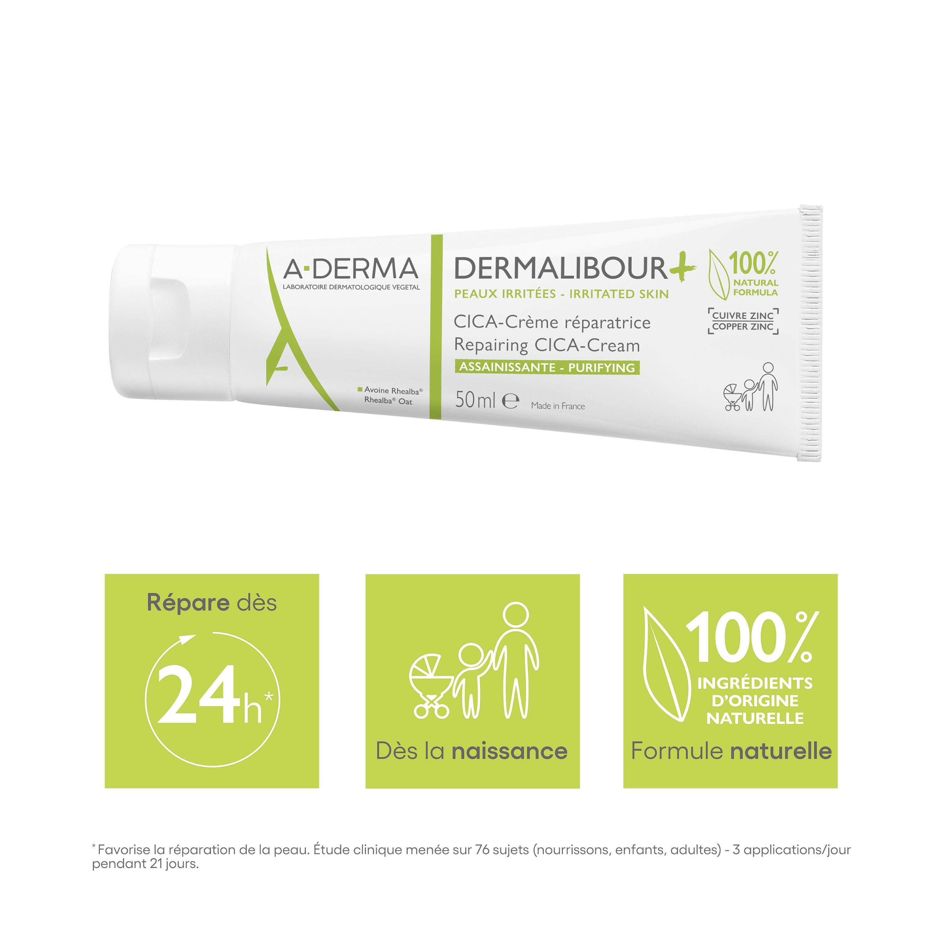 DERMALIBOUR+ CICA-Crème réparatrice assainissante apaise immédiatement, répare* et assainit les peaux irritées de toute la famille dès la naissance. Les zones du corps et du visage qui rougissent, piquent ou tiraillent bénéficient de sa formule efficace dès 24h¹ et 100 % d'origine naturelle.
