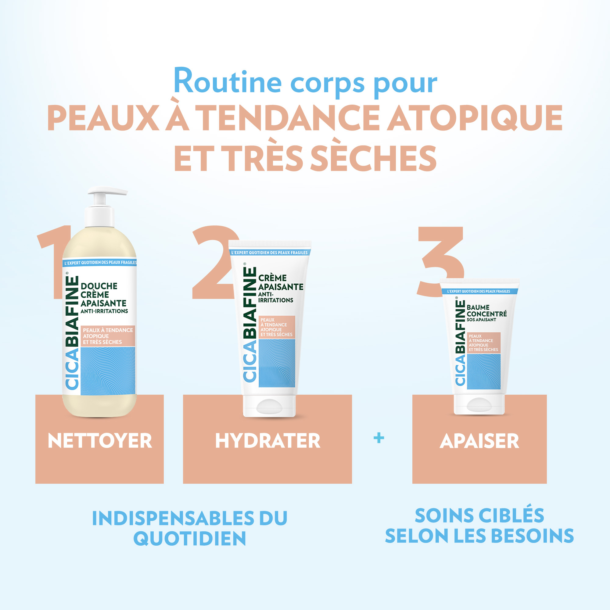 La Crème Hydratante Corporelle Anti-Irritations Cicabiafine agit à deux niveaux : premièrement, elle soulage immédiatement les sensations de démangeaisons et les irritations. La crème est enrichie en panthénol, actif reconnu pour ses propriétés apaisantes. Elle agit dès la 1ère application. Ensuite, elle hydrate* et répare intensément, grâce à sa formule contenant une forte concentration en glycérine et huiles végétales (beurre de karité et huile d’avoine). Cela permet d’améliorer significativement l’aspect et la texture de la peau (rougeurs, squames et rugosités). Soulagée et nourrie, votre peau retrouve confort et douceur jour après jour. Elle convient aux peaux extra-sèches avec sensations de démangeaisons et irritations, ainsi qu'aux peaux à tendance atopique. La Crème Cicabiafine est adaptée à toute la famille : bébés, enfants, adultes. Sans parfum et , elle pénètre rapidement et offre une texture crémeuse non grasse. Ce produit hypoallergénique** est développé sous contrôle médical et testé cliniquement. * Hydratation des couches supérieures de l'épiderme ** Formulé pour minimiser les risques d'allergies.