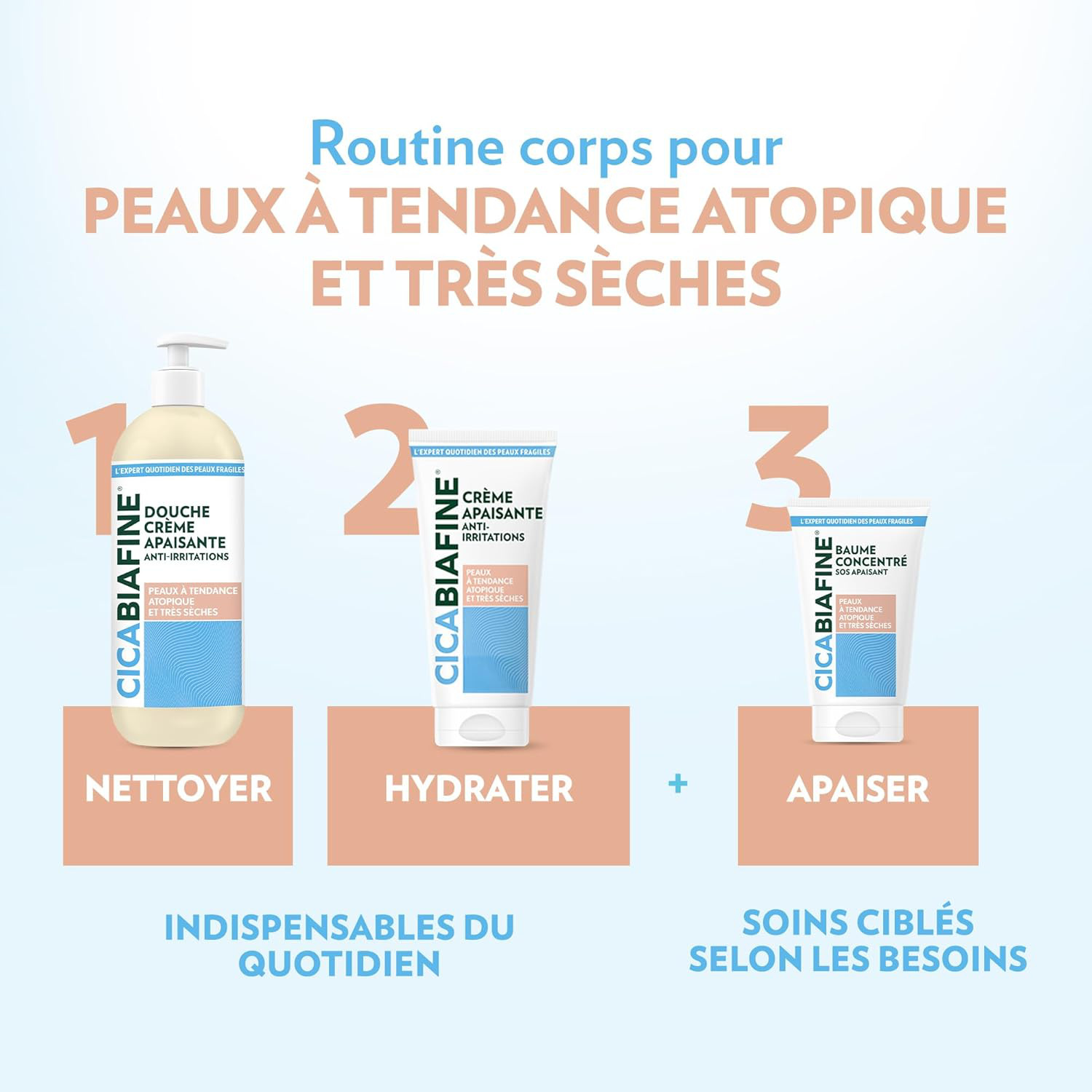 Appliquer 2 fois par jour, de préférence après la toilette avec la crème de douche hydratante anti-irritations CicaBiafine® sur une peau préalablement séchée.