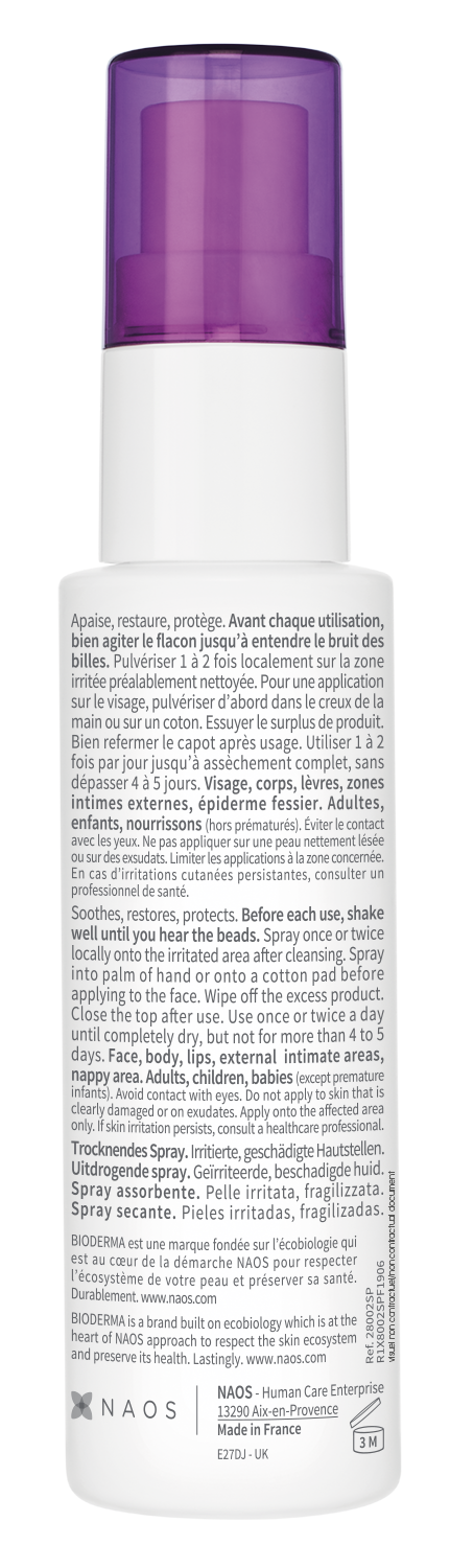 Avant chaque utilisation, bien agiter le flacon jusqu’à entendre le bruit des billes. Pulvériser localement sur la zone irritée préalablement nettoyée.Pour une application sur le visage, pulvériser d’abord dans le creux de la main ou sur un coton. Bien refermer le capot après usage. Utiliser 2 fois par jour jusqu’à assèchement complet