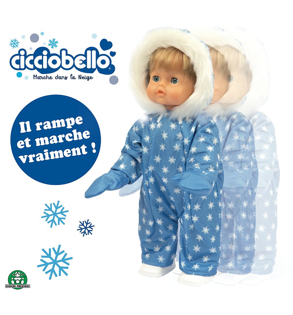 | Plus produit | INTERACTIF: Tape dans tes mains et il avance ou rampe vers toi, comme un vrai bébé!\n EFFETS SONORES: Ton Cicciobello fait de tendres gazouillis...on dirait un vrai!\n HIVER: Ton Cicciobello porte une adorabale combinaison bleue avec une capuche avec de la fourrure toute douce et une jolie paire de gants.\n TAILLE: Le poupon meure 40 cm. Corps dur.\n PILES REQUISES : Fonctionne avec 3 piles AA non incluses.\n AGE : Pour les enfants à partir de 3 ans.\n |