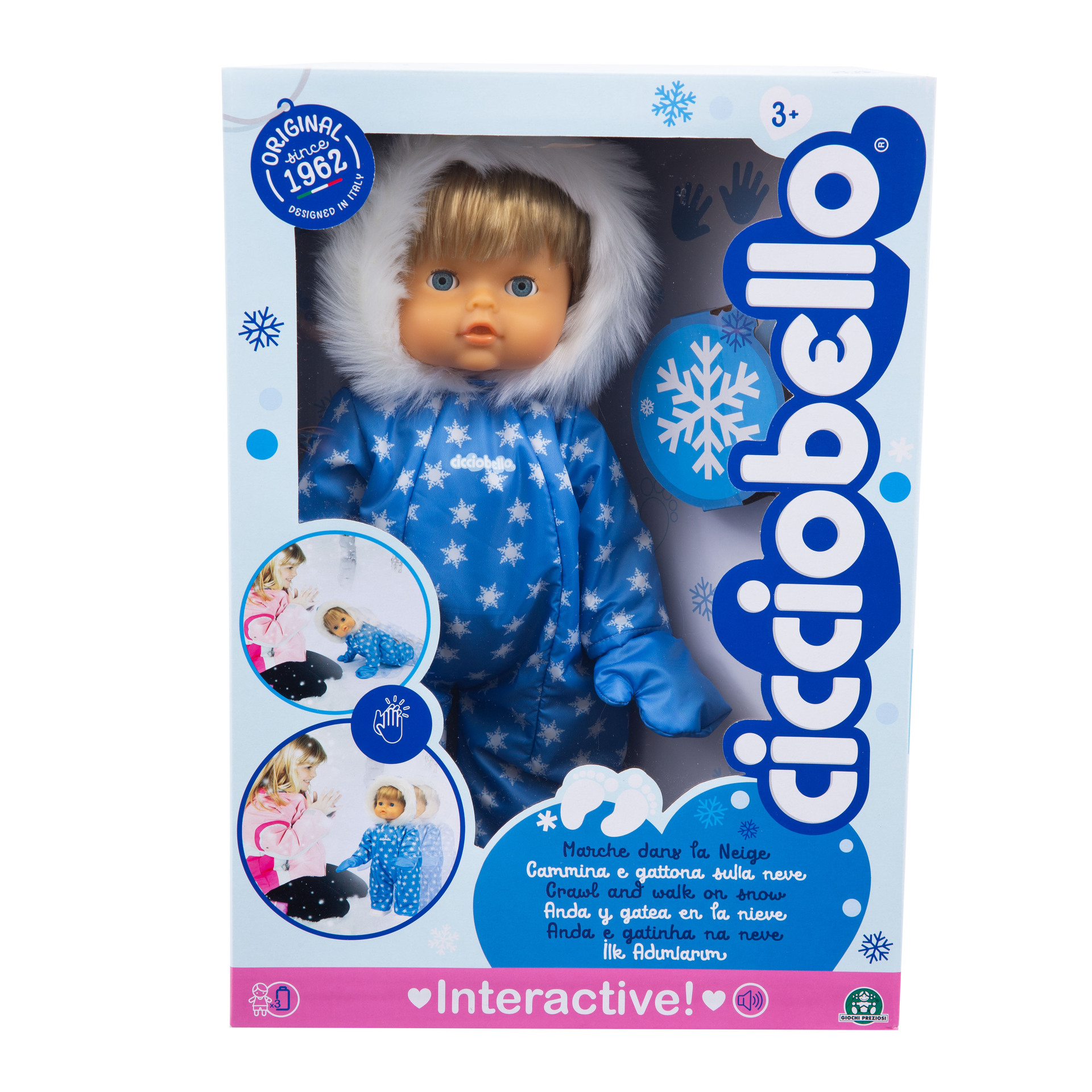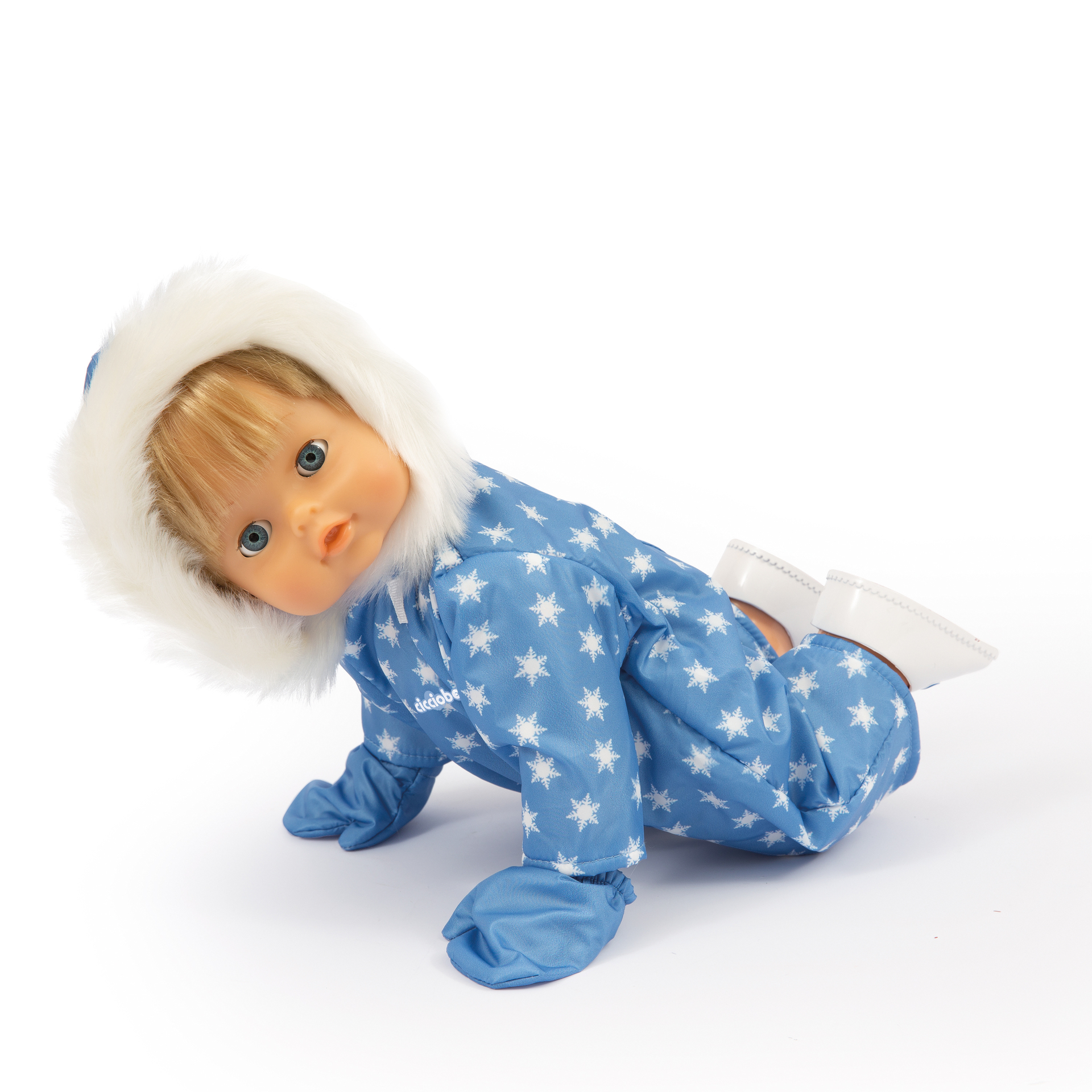 | Plus produit | INTERACTIF: Tape dans tes mains et il avance ou rampe vers toi, comme un vrai bébé!\n EFFETS SONORES: Ton Cicciobello fait de tendres gazouillis...on dirait un vrai!\n HIVER: Ton Cicciobello porte une adorabale combinaison bleue avec une capuche avec de la fourrure toute douce et une jolie paire de gants.\n TAILLE: Le poupon meure 40 cm. Corps dur.\n PILES REQUISES : Fonctionne avec 3 piles AA non incluses.\n AGE : Pour les enfants à partir de 3 ans.\n |