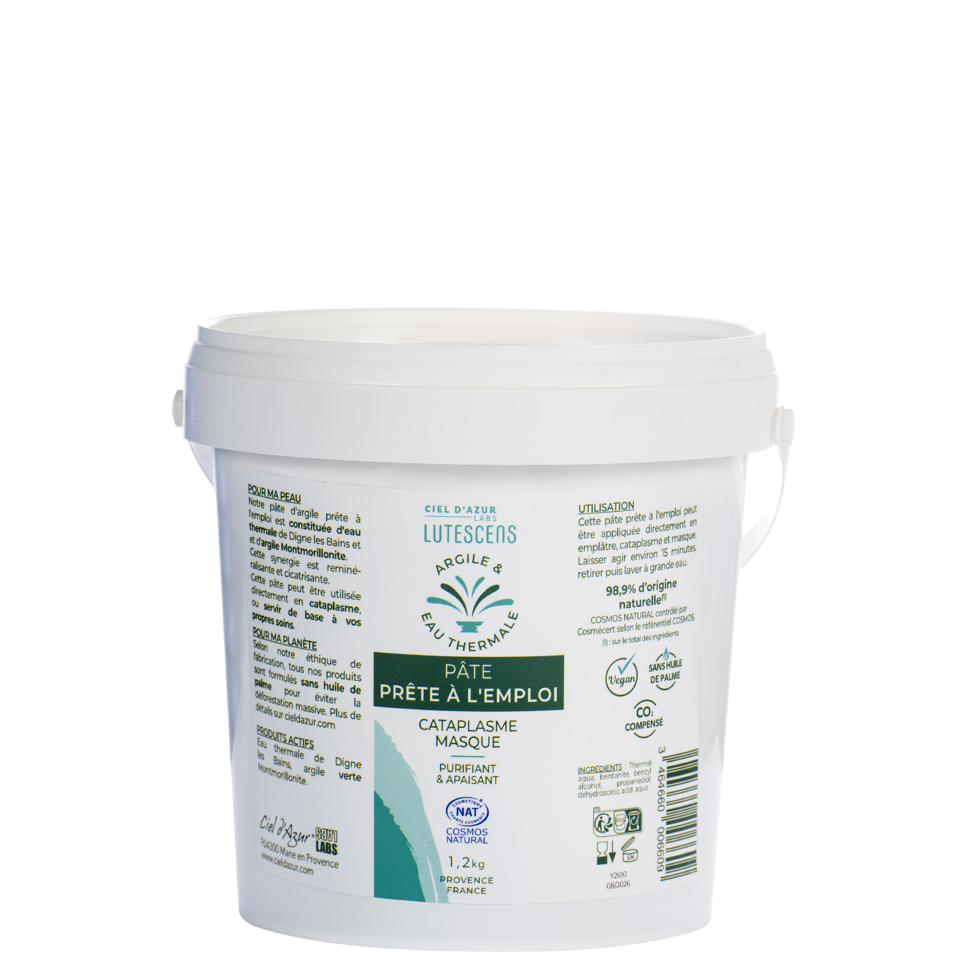 Notre pâte d’argile prête à l’emploi est constituée d’eau thermale de Digne les Bains et d’argile Montmorillonite. Cette synergie est reminéralisante et cicatrisante. Cette pâte peut être utilisée directement en cataplasme, ou servir de base à vos propres soins.