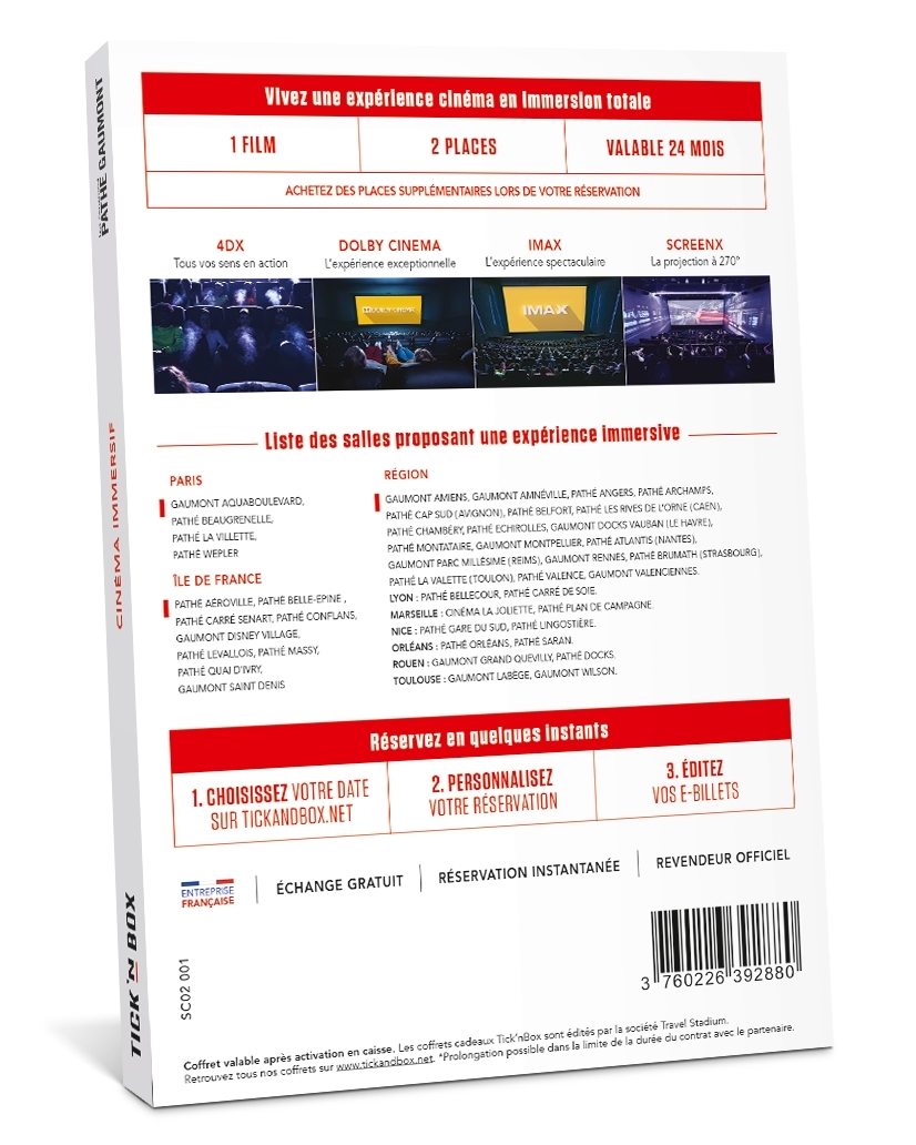 Profitez des 45 meilleurs cinémas Pathé Gaumont pour vivre une expérience en immersion totale. Ces salles à la pointe de la technologie vous feront vivre une expérience inoubliable. Avec Tickn'Box, plongez dans l'univers du cinéma immersif : - 4DX (tous vos sens en actions) - Dolby Cinéma (l'expérience exceptionnelle) - IMAX (L'expérience spectaculaire) - SCREENX (La projection à 270°) Dans votre Tickn'Box, vous découvrirez : Un chèque cadeau échangeable contre 2 places de cinéma pour une séance immersive dans une salle Pathé Gaumont technologique. Ce chèque permet de réserver votre salle en vous connectant sur le site tickandbox.net. Le coffret est valable pour 2 places, 24 mois à compter de sa date d’achat. Tickn'Box est revendeur officiel de Pathé Gaumont. Choisissez votre séance et vivez une expérience unique. Votre expérience est totalement personnalisable lors de votre réservation en ligne (ajout d'entrées au meilleur prix du moment)
