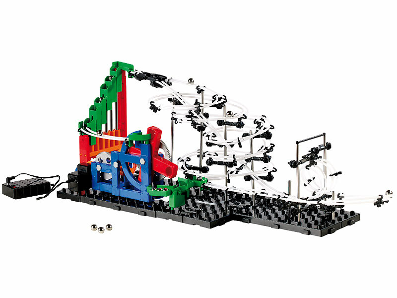 Avec looping, spirales et ascenseur motorisé - 245 pièces Vibrez lors de courses folles dans un grand huit incroyable : looping et pentes vertigineuses offrent des sensations fortes aux petits comme aux grands ! Vous pouvez même faire rouler plusieurs billes en même temps. Ce circuit à billes façon montagne russe est à monter soi-même. Cela nécessite un peu de temps et de patience, mais stimule la créativité, le doigté, et l'engouement pour la technique. Vous pouvez construire tous les modèles que vous pouvez imaginer ! Circuit à billes montagnes russes - niveau avancé À partir de 14 ans 245 pièces Avec 14 billes d’acier, Ø 13 mm Avec éléments spéciaux : looping, spirales et ascenseur motorisé Fonctionne avec télécommande : nécessite 3 piles AA 1,5 V (non fournies) Inclus : notice de montage complète avec propositions de modèles Longueur rail env. 5,5 m